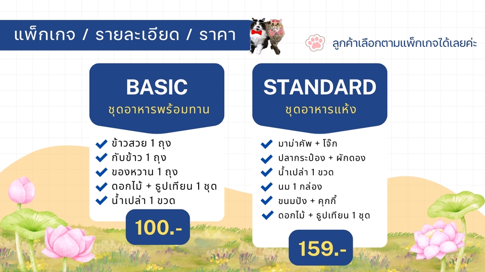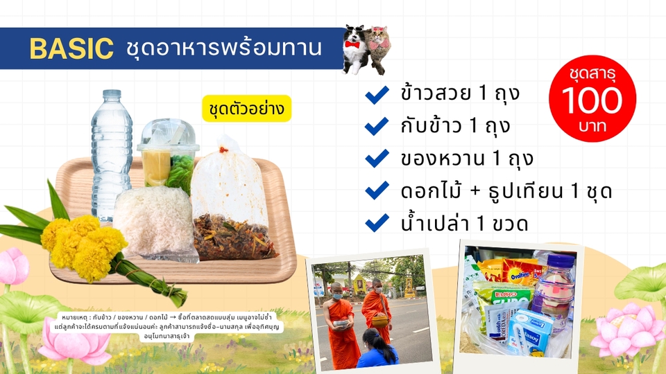 ฿100บริการรับจัดชุดตักบาตร & ใส่บาตรแทนลูกค้า 🙏✨ ✅ข้าวสวย 1 ถุง ✅กับข้าว 1 ถุง ✅ของหวาน 1 ถุง ✅ดอกไม้ + ธูปเทียน 1 ชุด ✅น้ำเปล่า 1 ขวด หมายเหตุ : กับข้าว / ของหวาน / ดอกไม้ → ซื้อที่ตลาดสดแบบคละค่ะ