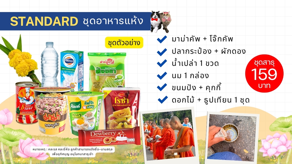 ฿159บริการรับจัดชุดตักบาตร & ใส่บาตรแทนลูกค้า 🙏✨ ✅มาม่าคัพ + โจ๊กคัพ ✅ปลากระป๋อง + ผักดอง ✅น้ำเปล่า 1 ขวด ✅นม 1 กล่อง ✅ขนมปัง + คุกกี้ ✅ดอกไม้ + ธูปเทียน 1 ชุด หมายเหตุ : คละรส คละยี่ห้อ นะคะ