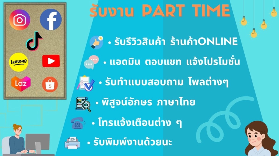 รับรีวิวสินค้าหรือร้านค้าในแพลตฟอร์มต่างๆ แอดมินดูแลเพจ ตอบแชทไว ไม่ดองแชท ทำแบบสอบถามหรือโพลต่างๆ พิสูจน์อักษรเอกสาร โทรแจ้งเตือน พูดคุยได้ทุกเรื่อง รับพิมพ์งานทั้งภาษาไทยและภาษาอังกฤษ