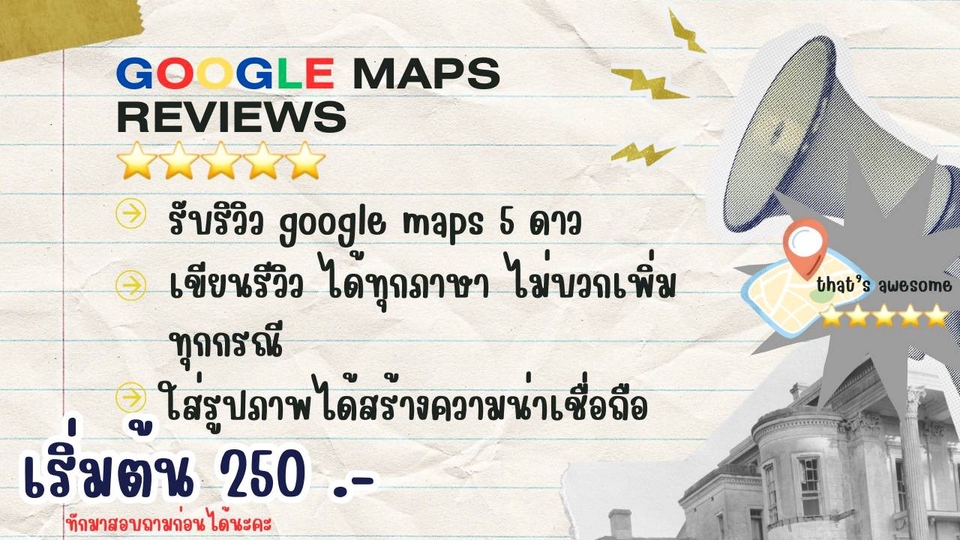 ⭐รีวิว Google maps 5 ดาว ⤵️ • รีวิวได้หลากหลายภาษา + รูปภาพได้ ไม่บวกราคาเพิ่ม •ใช้เวลา1 งาน ไม่เกิน 2-7 วัน •ใช้แอคคุณภาพ มีตัวตนจริงๆ ไม่ใช้แอคอวตาร •สร้างความหน้าเชื่อถือ ให้กับร้านหรือสถานที่นั้นๆ