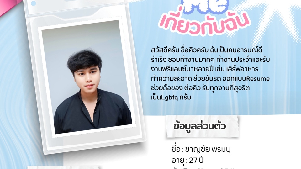 รับทุกงานที่ทำได้ สุจริต - ทำความสะอาดบ้าน ช่วยจัดของ -ขับรถรับส่ง มีรถยนต์ จักรยานยนต์ -ออกแบบ resume -พิมพ์เอกสาร -ช่วยถือของ ต่อคิว -ออกแบบการ์ดงานแต่ง งานบวช -ทำสไลด์งาน และอีกหลายงาน ขอแค่รายละเอียดงานชัดเจน เป็น LGBTQ ไม่เลือกงาน ขอเป็นงานพาร์ทไทม์ หรือ รายชั่วโมงครับ