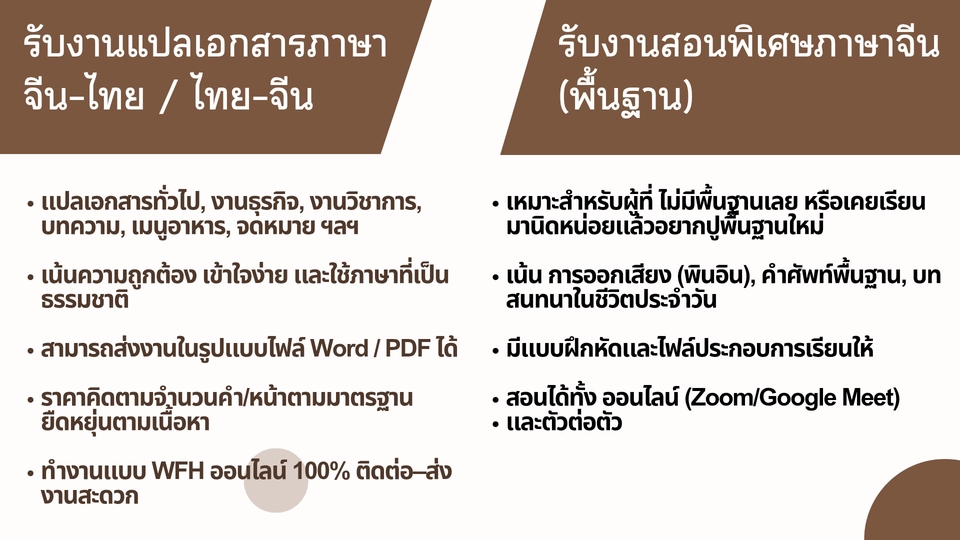 *รับงานแปลเอกสารภาษาจีน–ไทย / ไทย–จีน* แปลเอกสารทั่วไป, งานธุรกิจ, งานวิชาการ, บทความ, เมนูอาหาร, จดหมาย ฯลฯ เน้นความถูกต้อง เข้าใจง่าย และใช้ภาษาที่เป็นธรรมชาติ สามารถส่งงานในรูปแบบไฟล์ Word / PDF ได้ 📚 สอนพิเศษภาษาจีน (พื้นฐาน ) เหมาะสำหรับผู้ที่ ไม่มีพื้นฐานเลย หรือเคยเรียนมานิดหน่อยแล้วอยากปูพื้นฐานใหม่ เน้น การออกเสียง (พินอิน), คำศัพท์พื้นฐาน, บทสนทนาในชีวิตประจำวัน สอนออนไลน์