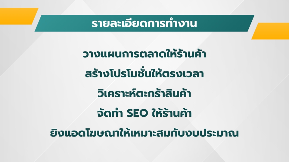 ฿4,5001. วางแผนทำโปรโมชั่นการตลาดให้มียอดขายเพิ่มขึ้น โดยอ้างอิงจาก Business Insight 2 โปรโมชั่น 2. เข้าร่วมแคมเปญใหญ่ๆ ประจำเดือนของแพลทฟอร์ม ตามตกลง 1 แคมเปญ 3. ดูแล Keyword Ads ปรับปรุงคีย์เวิร์ด ให้สามารถเพิ่มยอดขายให้กับร้านค้าได้สูงสุด 4. วางแผนงบประมาณโฆษณา 10 แคมเปญ (ไม่รวมงบโฆษณา) 5. แนะนำ วางแผน รูปแบบร้านค้า และ สินค้า (ไม่รวมการทำ artwork) 6. แนะนำการซื้อแพคเกจกับ platform ที่เหมาะสม (ไม่รวมค่าแพคเกจ)