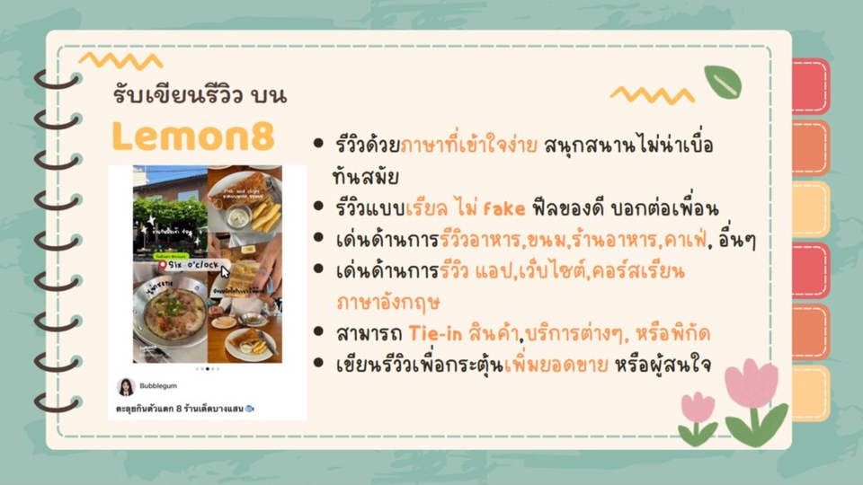 รับเขียนรีวิวบน lemon8 - รับรีวิวสินค้า,ร้านค้าอาหาร,บริการหรือสถานที่,และประสบการณ์ในด้านต่างๆ - รับรีวิวแอป,เว็บไซต์ เกี่ยวกับการเรียนด้านภาษาอังกฤษ, เรียนต่อ รีวิวคอร์สเรียนภาษาอังกฤษต่างๆ - รีวิวเพิ่มยอดขาย, สร้างฐานคนรู้จัก - รีวิวให้ได้ฟีลของดีบอกต่อเพื่อน - ใช้ภาษาที่เข้าใจง่าย ทันสมัย อ่านแล้วไม่เบื่อ ขั้นตอนการทำงานสำหรับ รับเขียนรีวิวบน Lemon8 1. คุยรายละเอียดงาน ลูกค้าบรีฟงานหรือสิ่งที่ต้องการ 2. คอนเฟิร์มจ้างงาน - ชำระค่าบริการ และกำหนดวันส่งงาน 3. เริ่มทำงาน และส่งดราฟให้ตรวจตามกำหนด ขั้นตอนการทำงาน 1. ลูกค้าคุยรายละเอียด, บรีฟงาน และแจ้งสิ่งที่ต้องการ 2. ลูกค้าคอนเฟิร์มจ้างงาน,ชำระค่าบริการ และกำหนดวันส่งงาน 3. เริ่มทำงาน และส่งดราฟให้ตรวจตามกำหนดที่ตกลงกับลูกค้า 4. ลูกค้ารับงาน