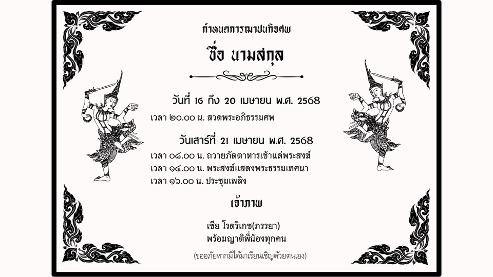 รับทำภาพกำหนดพิธีการงานศพ - ใช้เป็นภาพสำหรับแจ้งข่าวการเสียชีวิต แจ้งกำหนดการ และพิธีการต่าง ๆ แก่ญาติหรือเพื่อนได้สะดวก - ราคา 100.- บาท - สามารถทำตามแบบลูกค้า หรือลูกค้าสามารถเลือกแบบได้ มีตัวอย่างให้เลือก - สามารถใส่ภาพผู้วายชนม์หรือไม่ก็ได้ - งานด่วน งานไว ตอบกลับทันที ทันใจลูกค้าอย่างแน่นอน