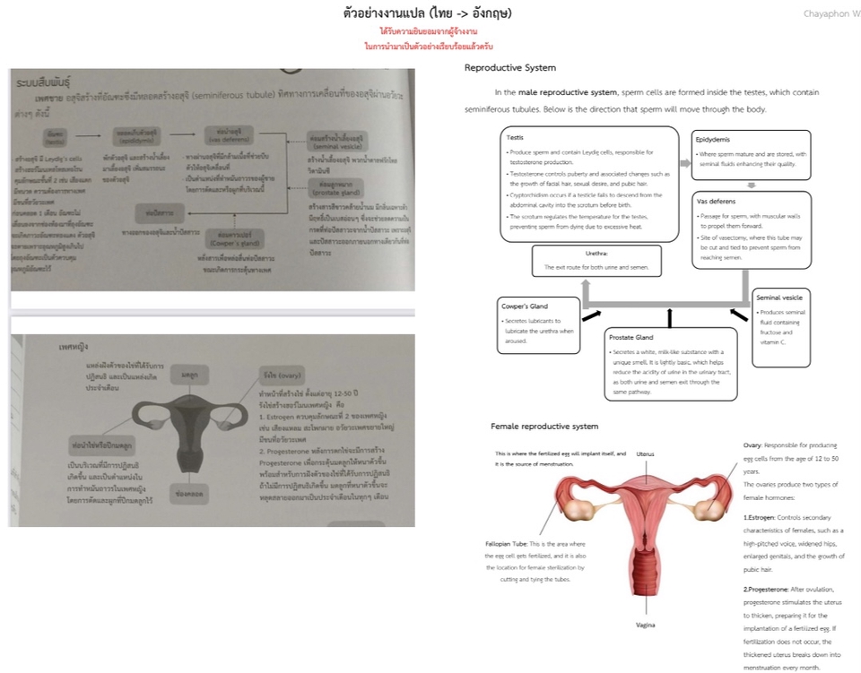 จบการศึกษาจากมหาวิทยาลัยศิลปากร คณะอักษรศาสตร์ สาขาเอกวิชาภาษาอังกฤษ (TOEFL IBT : 630/677) ปัจจุบันทำงานพาร์ทไทม์ให้กับบริษัทสุขโข ทรานสเลชั่น และเป็นนักแปลฟรีแลนซ์ที่มีประสบการณ์การทำงาน (ดังตัวอย่างงานที่ได้แนบไปครับ) รับแปลภาษา TH-EN และ EN-TH เชี่ยวชาญในการแปลเอกสาร, บทความทั่วไป, ข่าว, เนื้อหาเกี่ยวกับวิดีโอเกมส์ ภาพยนตร์ นวนิยาย และเอกสารอื่น ๆ สามารถสอบถามได้ครับ ขั้นตอนการทำงาน 1. ผู้แปลทำการสกรีนงาน ว่างานอยู่ในขอบเขตที่ตนถนัดหรื่อไม่ 2. ผู้แปลพิจารณาปริมาณงาน (จำนวนหน้าของเอกสาร) ระยะเวลาการทำงาน และค่าตอบแทน ว่าสอดคล้องและสมเหตุสมผลกันหรือไม่ 3. ถ้าสองข้อแรกสามารถยอมรับได้ ผู้แปลจะเสนอตัวเข้ารับงาน 4. ถ้าผู้ว่าจ้างตกลงเลือกให้ทำงานนี้ ผู้แปลจะเริ่มทำงานทันที และรักษาระยะเวลาให้ตรงตาม milestones ที่ตกลงกันอย่างละเอียดและรอบคอบ 5. ผู้แปลส่งงานที่ทำสำเร็จแล้วคืนผู้ว่าจ้างตาม milestone ที่ตกลงกันไว้ และหากต้องการให้มีการแก้ไข ผู้ว่าจ้างสามารถแจ้งผู้แปลได้ 6. เมื่อผู้ว่าจ้างยอมรับงานทั้งหมดแล้วในทุก milestone ก็จะถือว่างานนี้เสร็จสิ้นแล้ว