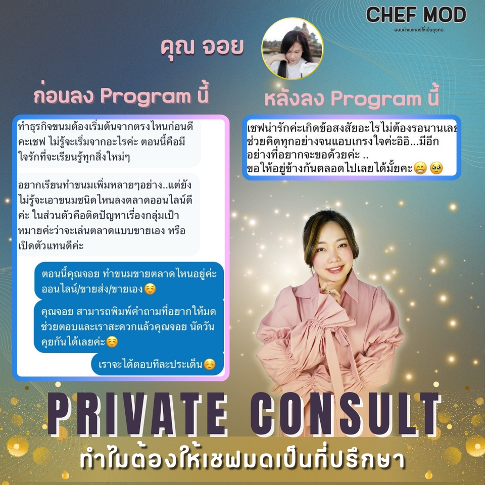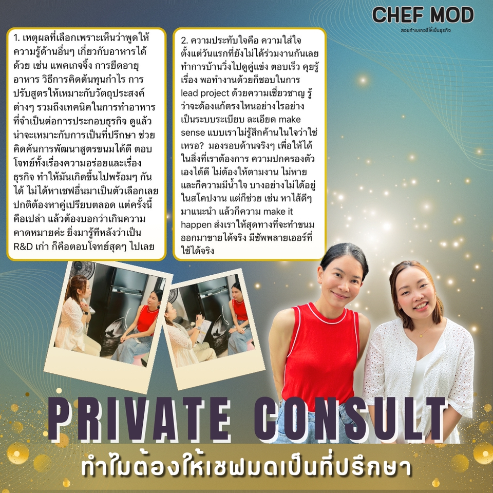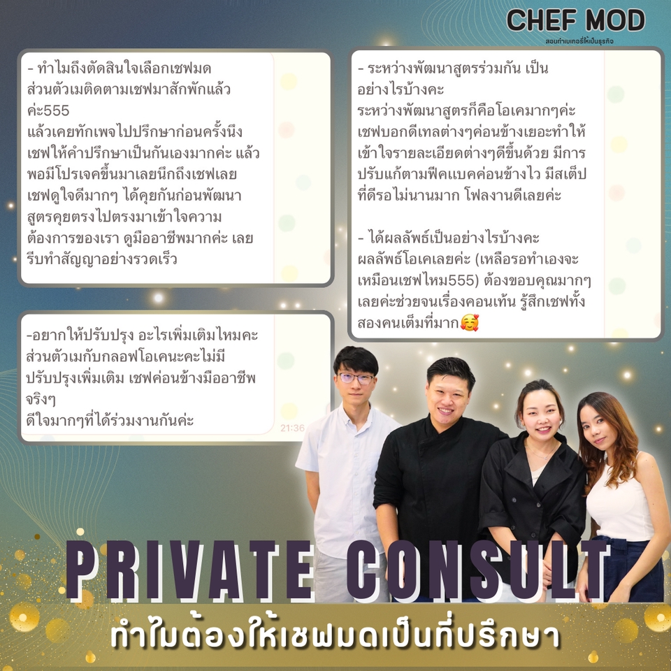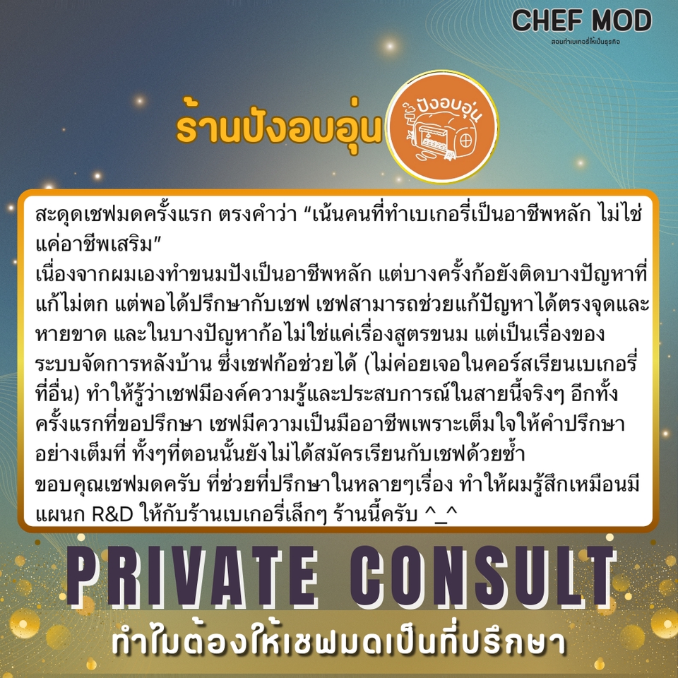 สิ่งที่คุณจะได้รับในโปรแกรมนี้: ✅ วางกลยุทธ์และแนวทางแก้ไขปัญหาเฉพาะธุรกิจของคุณ • รับสิทธิ์ปรึกษาส่วนตัวแบบออนไลน์ 2-3 ชั่วโมง/ครั้ง แบ่งเป็น 2-3 ครั้ง ❇️ ติดตามผลและปรึกษาส่วนตัวผ่านข้อความและ VDO Call ตามแพคเกจที่เลือก (มี Line กลุ่มส่วนตัว) จากการทำงานเป็นทีม R&D ในสายโรงงาน และ การทำเป็น Pastry Chef ในโรงแรม นั้น เชื่อว่าการทำขนมให้อร่อยและเป็นที่ต้องการของตลาด มันขายได้จริงนั้น จำเป็นต้องมีความรู้และเครื่องมือบางอย่างในการทำให้คุณไปถึงฝันนั้นได้เร็วขึ้น ไม่ว่าคุณจะอยู่ในตลาดไหนในการทำเบเกอรี่ ถ้าคุณมีเป้าหมาย เชฟมดและทีมงาน พร้อมที่จะไปกับเป้าหมายของคุณ! ขั้นตอนการทำงาน 1. พูดคุย สอบถามรายละเอียดที่ข้อความ 2. ตกลงตามPackage ที่เลือก 3. แจ้งชำระเงิน 4. ดำเดินการแก้ไขปัญหาต่างๆ 5. สรุปผล ติดตามผล