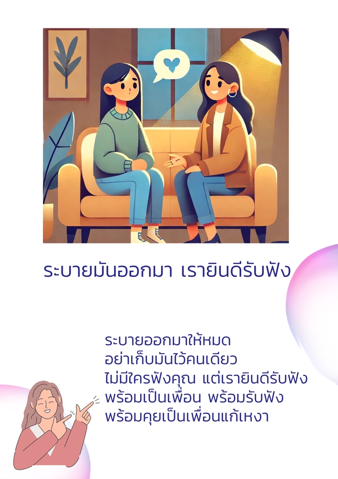 ไม่รู้จะคุยกับใคร ไม่รู้จะระบายกับใคร มาคุยกับเรานะ รับฟังปัญหาชีวิต เล่าออกมาให้หมดไส้หมดพุง อย่าเก็บมันไว้ มีปัญหาไม่ใช่เรื่องผิด อย่ารู้สึกผิด ชีวิตมันก็แบบนี้แหละ ขั้นตอนการทำงาน 1. นัดหมายเวลาที่ต้องการพูดคุย ( นัดหมายล่วงหน้า 1 วันสามารถพูดคุยได้ทั้งแช็ตไลน์หรือเมสเซ็นเจอร์) 2. ทำการพูดคุยระบายปัญหาและให้คำแนะนำ 3. ติดตามปัญหา เพื่อให้ผู้ว่าจ้างได้พรัอมที่จะเผชิญหน้าต่อไป