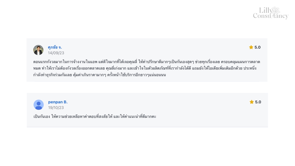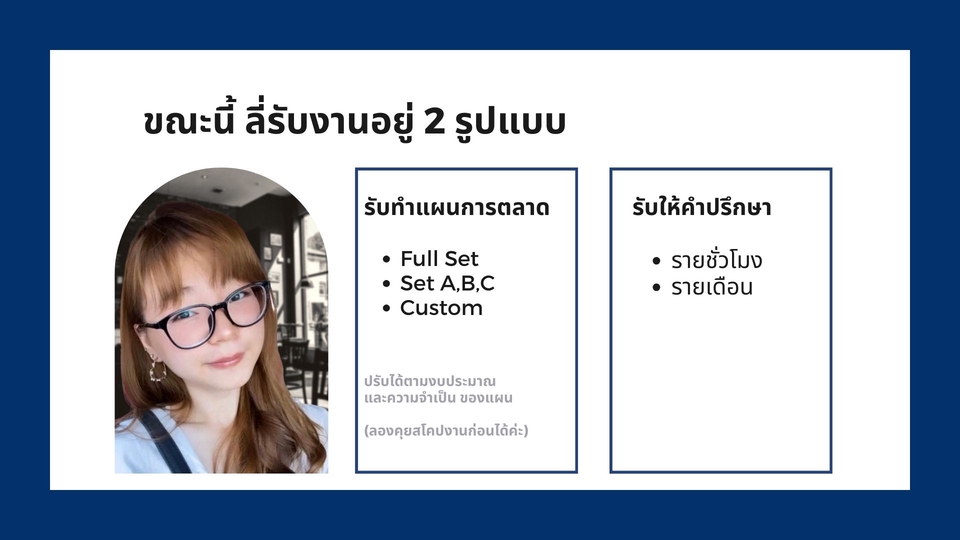 ลี่จะช่วยทำให้ ลูกค้าจำคุณได้ เสิร์ชหาคุณเจอ 'แม้จะจำชื่อแบรนด์คุณไม่ได้ก็ตาม' . รับปรึกษาการสร้างแบรนด์อย่างมีหลักการ ด้วยความรู้ด้านการตลาดดิจิทัล ระดับปริญญาโท คุณไม่จำเป็นต้องรู้ทุกอย่างเกี่ยวกับการตลาดออนไลน์ คุณรู้เท่าที่คุณต้องใช้ในธุรกิจตนเองก็พอ . ติดต่อมาได้เลยค่ะ เดี๋ยวลี่ช่วยดูให้:) ขั้นตอนการทำงาน 1. ส่งข้อมูลธุรกิจ และ ช่องทางการขายทั้งหมดให้ลี่เข้าไปศึกษาล่วงหน้า 2. นัดวันเวลาเพื่อนัดพูดคุยกัน 3. ทำงาน + ส่งมอบงาน (ถ้ามี)