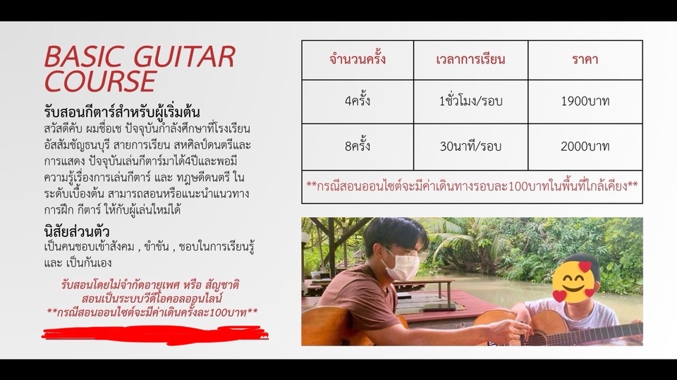 สวัสดีคับ🙏 ผมชื่อเช ปัจจุบันกำลังศึกษาที่โรงเรียน อัสสัมชัญธนบุรี สายการเรียน สหศิลป์ดนตรีและการแสดง ปัจจุบันเล่นกีตาร์มาได้4ปีและพอมี ความรู้เรื่องการเล่นกีตาร์ และ ทฤษดีดนตรี ในระดับเบื้องต้น สามารถสอนหรือแนะนำแนวทางการฝึก กีตาร์ ให้กับผู้เล่นใหม่ได้ครับ ✅รายละเอียดคอร์ส✅ เรียน4ครั้ง 1ชม/รอบ ราคา1900บาท/คอร์ส เรียน8ครั้ง 30นาที/รอบ ราคา2000บาท/คอร์ส ***กรณีสอนออนไซต์จะมีค่าเดินทางรอบละ 100บาทในพื้นที่ใกล้เคียง***