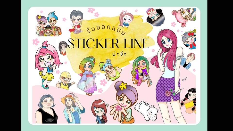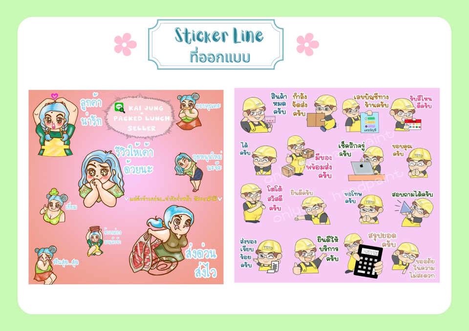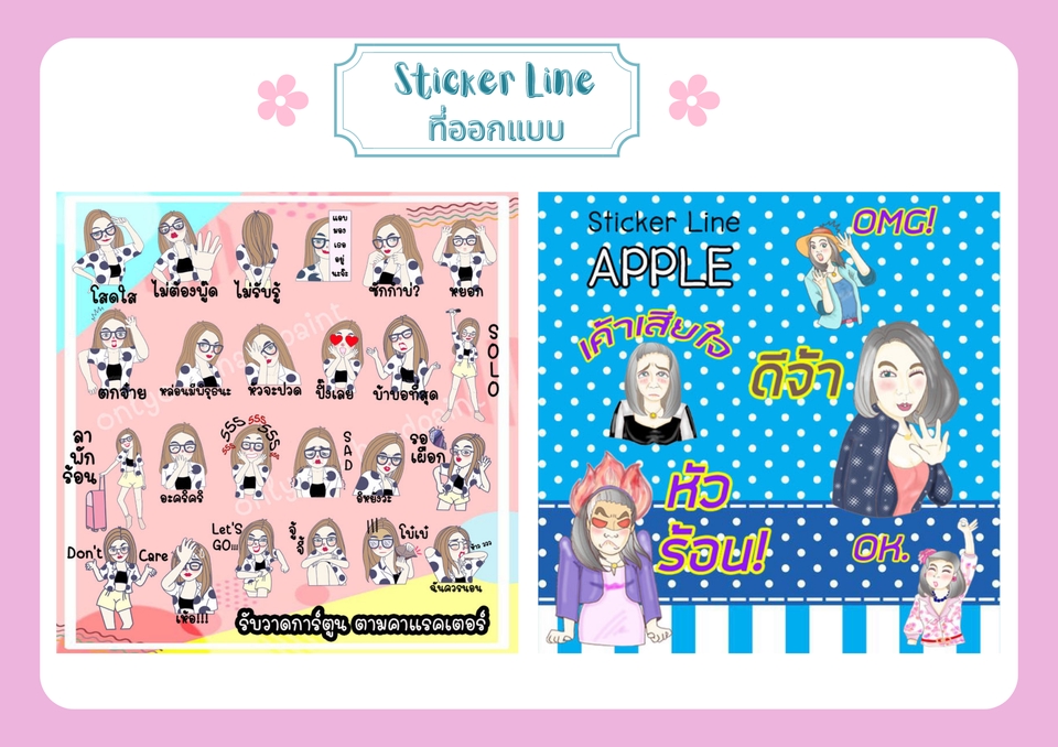 รับออกแบบ สติกเกอร์ไลน์ (Sticker Line) หลากหลายสไตล์ ตามความต้องการของลูกค้า ผลงานที่ผ่านมาจะเป็น สไตล์ น่ารัก/ชื่อคน/คนเป็นตูน/สัตว์ต่างๆ/ตัวอักษร เริ่มต้น ที่ 8 ตัว 1,200 บ. แก้ไขงาน ฟรี! 2 ครั้ง ส่งไฟล์ เป็น PNG. ขนาดตามที่ทาง Line กำหนด ตามจำนวนที่ลูกค้าสั่งวาดมาค่ะ ระยะเวลาวาด Net สุด 25 วัน (40 ตัว) เรทราคา ตามจำนวนคาแรคเตอร์ : - 8 ตัว 1,200 บ. ใช้เวลา 5 วัน -16 ตัว 2,400 บ. ใช้เวลา 10 วัน - 24 ตัว 3,600 บ. ใช้เวลา 14 วัน - 32 ตัว 4,800 บ. ใช้เวลา 20 วัน - 40 ตัว 6,000 บ. ใช้เวลา 25 วัน สิ่งที่พิเศษ เสนอให้ลูกค้า : - หากงานมีการ รีเจค จะแก้ไขงาน ฟรี! จนกว่าจะผ่าน - ฟรี ! ภาพ Main & ภาพ Tab ขั้นตอนการทำงาน 1. - ลูกค้า แจ้งความต้องการ ของคาแรค้เตอร์ ที่จะให้วาด หรือหากมีตัวอย่างความต้องการมาให้จะดีมาก * รบกวนลูกค้า แจ้ง คำพูดที่ต้องการ ใส่ใน Sticker Line มาให้ทางร้าน ตามจำนวนที่ต้องการด้วยคะ 2. -ทางร้านจะออกแบบและส่งแบบร่างให้ลูกค้าพิจารณาดูก่อน (แก้ไข 1ครั้ง ) 3. - ทางร้านจะลงมือออกแบบพร้อมลงสี ส่งกลับให้ลูกค้าพิจารณาก่อน 1 ตัว1 คาแรคเตอร์ 4. - หลังจากนั้น...วาดยาว ครบตามจำนวน (แก้ไข 1 ครั้ง) 5. - นัดส่งมอบงาน เป็น ไฟล์ PNG. ตามขนาดที่ทาง Line กำหนด