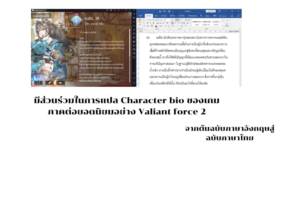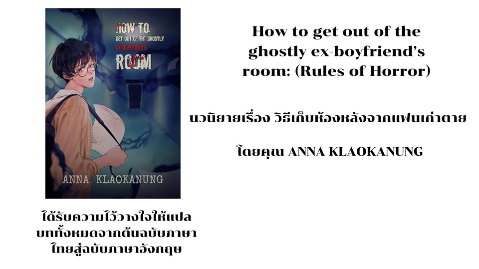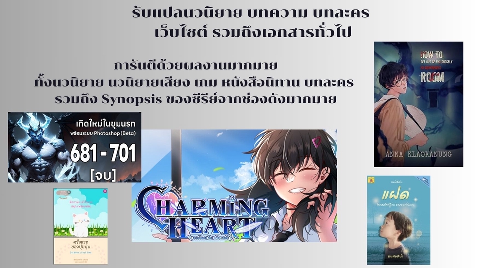 รับแปลนวนิยาย บทความ บทละคร เรื่องสั้น ข่าว ทั้งไทย-อังกฤษ และ อังกฤษ-ไทย ราคามิตรภาพ ดูความเหมาะสมตามเนื้องาน มีความเชี่ยวชาญในการแปลนวนิยายและบทละครเป็นพิเศษ ผลงานที่ผ่านมา: Script English Version เกม Visual Novel Charming Heart (วางจำหน่ายทางแพลทฟอร์ม Steam) นวนิยายเรื่อง วิธีเก็บของในห้องหลังแฟนเก่าตาย English version. นวนิยาย เรื่อง แฝด Enghlish version. Story line เรื่องย่อ Character info บทสนทนา เพลง ข่าว คู่มือ มังงะ จดหมายเชิญชวนทำบุญ *สามารถขอดูตัวอย่างงานได้ครับ ขั้นตอนการทำงาน 1. ลูกค้าแจ้งความต้องการ 2. ประเมินความต้องการของลูกค้า 3. ลงมือแปลให้ออกมาตามความต้องการของลูกค้าหรือสารต้นฉบับ 4. ส่งงานให้ลูกค้าอนุมัติ