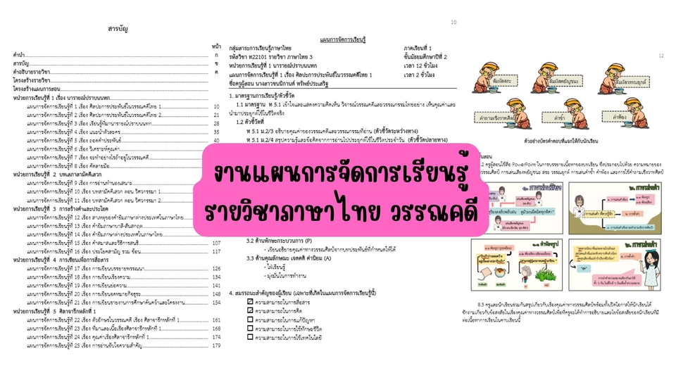 -จัดทำแผนการจัดการเรียนรู้รายวิชาภาษาไทย ระดับชั้นประถมศึกษาและระดับชั้นมัธยมศึกษา -จัดทำแผนการจัดการเรียนรู้รายวิชาเพิ่มเติมภาษาไทย -จัดทำแผนการจัดการเรียนรู้วรรณคดี -ออกแบบสื่อกิจกรรมการเรียนรู้รายวิชาภาษาไทย ขั้นตอนการทำงาน 1. รับรายละเอียดการจ้างงานจากลูกค้า 2. ออกแบบงานตามที่ลูกค้ากำหนดใช้เวลา 2-5 วันแล้วแต่ความยากง่ายของงาน 3. ส่งงานฉบับแก้ไขให้ลูกค้าตรวจทานความถูกต้อง 4. แก้ไขงานตามที่ลูกค้าสั่ง / จัดทำงานตามที่ตกลงและมอบหมายให้ลูกค้า