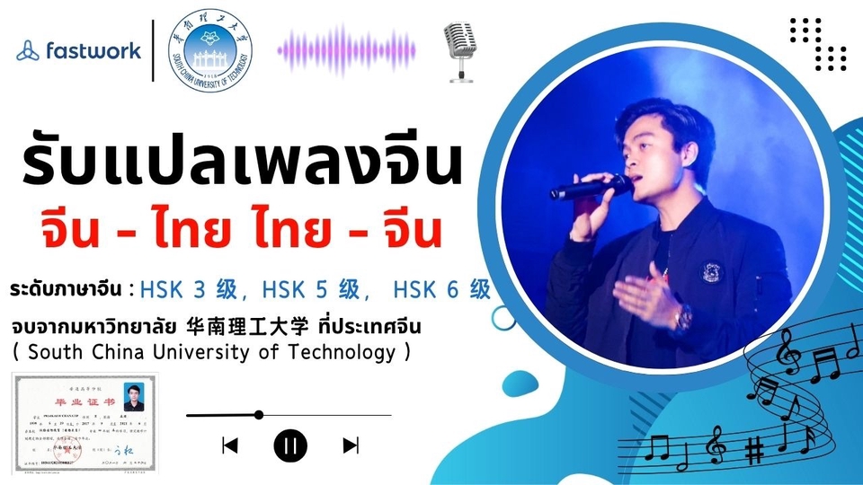 รายละเอียดงาน แปลเพลงภาษาจีน/ไทย : - แปลเนื้อเพลงภาษาจีน เป็น ไทย - แปลเนื้อเพลงภาษาไทยเป็นจีน ประสบการณ์และความเชี่ยวชาญ : - สอบผ่านวัดระดับภาษาจีน HSK - HSK 3/5 และ 6 (วัดระดับความสามารถด้านการฟัง/อ่าน/เขียนและเรียงความระดับสูง) - มีประสบการณ์เป็นล่ามภาษาจีนระหว่างเป็นนักศึกษาอยู่ที่ กว่างโจว ประเทศจีน - ฟัง/พูด/อ่าน/เขียน ภาษาจีนได้อย่างชำนาญ - ประสบการร้องเพลงจีนกว่า 7 ปี - มีประสบการณ์กว่า 5 ปี ด้านการแปลภาษา ขั้นตอนการทำงาน : 1. ลูกค้าพูดคุยรายละเอียดและความต้องการของงาน ว่าต้องการแบบไหน อย่างไร พร้อมส่งชิ้นงานให้ผู้แปล 2. ผู้แปลเสนอและตกลงราคากับลูกค้า เพื่อสร้างใบเสนอราคา โดยฟรีแลนซ์จะเริ่มทำงานเมื่อผู้ว่าจ้างจ่ายเงินเข้าระบบเรียบร้อยแล้ว 3. ส่งงานให้ผู้ว่าจ้างตรวจสอบภายในเวลากำหนด 4. หากมีให้แก้ไขสามารถแจ้งกลับเพื่อแก้ไขได้เลยครับ 5. หากไม่มีการแก้ไขเพิ่มเติม รบกวนกดอนุมัติงานและรีวิว 5 ดาว เพื่อเป็นกำลังใจในการทำงานต่อไปให้ด้วยนะคร้าบบบ ข้อกำหนดและเงื่อนไข ไม่รับงานที่เกี่ยวข้องกับการพนันและสิ่งผิดกฎหมาย