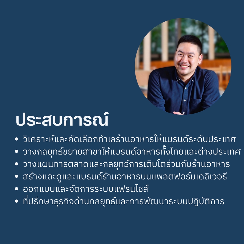 ประสบการณ์ตรงมากกว่า 5ปีจากบริษัทฟู้ดเดลิเวรีชื่อดัง ประสบการณ์ทำแบรนด์ และให้คำปรึกษาธุรกิจร้านอาหารตั้งแต่สตรีทฟู้ดจนถึงแบรนด์ระดับประเทศ