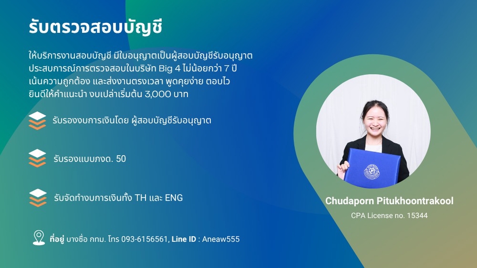 ให้บริการงานสอบบัญชี มีใบอนุญาตเป็นผู้สอบบัญชีรับอนุญาต และเคยมีประสบการณ์การตรวจสอบในบริษัท Big 4 มาไม่น้อยกว่า 7 ปี เน้นความถูกต้อง และส่งงานตรงเวลา พูดคุยง่าย ตอบไว ยินดีให้คำแนะนำ งบเปล่าเริ่มต้น 3,000 บาท