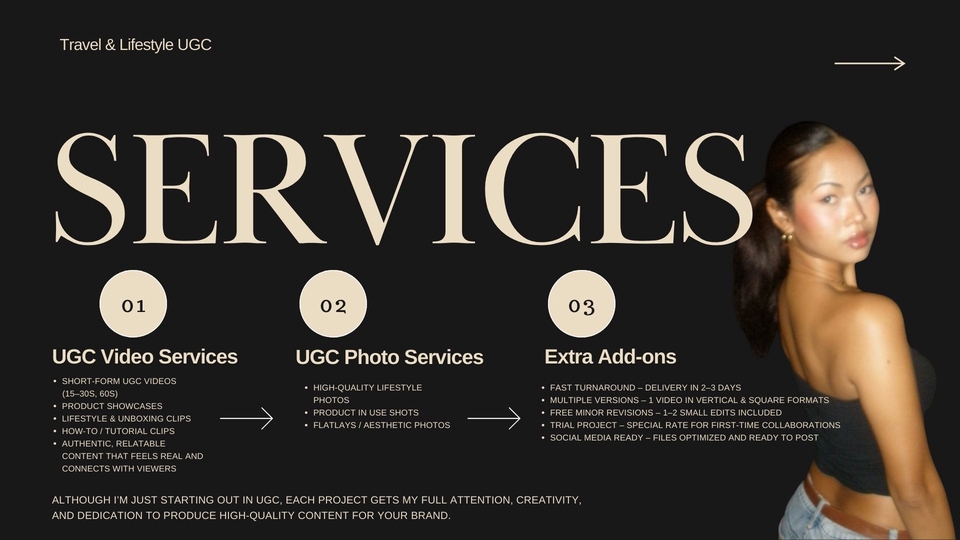 Social Media Manager & Content Creator ช่วยดูแลและสร้างคอนเทนต์ให้แบรนด์กลับมามีชีวิตบนโลกออนไลน์ เหมาะสำหรับธุรกิจที่อยากเริ่มอัปเดตเพจอย่างสม่ำเสมอ พร้อมภาพลักษณ์มืออาชีพและเข้าถึงกลุ่มลูกค้าได้ดีขึ้น รับถ่ายแบบเชิงพาณิชย์ทุกแนว (lifestyle, product, travel ฯลฯ) พร้อมให้แบรนด์นำภาพไปใช้ได้ทันที พร้อมช่วยให้แบรนด์ของคุณดูน่าเชื่อถือและมืออาชีพ