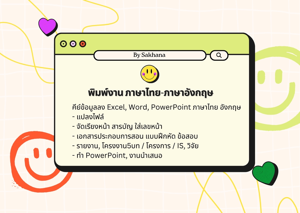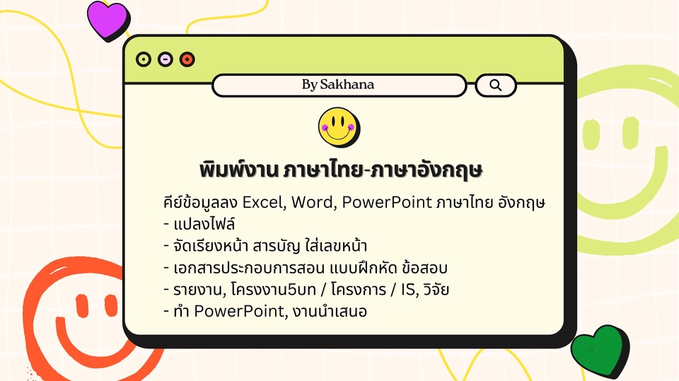 จบการศึกษาจากมหาวิทยาลัยวัลยลักษณ์ สาขาวิศวกรรมคอมพิวเตอร์และระบบอัจฉริยะ รับพิมพ์งาน รายงาน ข้อมูลสินค้า นิยาย แผนการเรียนการสอน คีย์ข้อมูล จากกหนังสือหรือเอกสารต่างๆ ทั้งภาษาไทยและภาษาอังกฤษ ทำงานรวดเร็ว ถูกต้อง ตามความต้องการ ขั้นตอนการทำงาน 1. ตกลงรายละเอียดกับลูกค้า เช่น เนื้อหาของงาน จำนวนหน้า ฟอนท์ 2. สรุปราคาให้ลูกค้าพิจารณา จัดทำใบเสนอราคา และชำระเงิน 3. ส่งงานให้ลูกค้าตรวจสอบความถูกต้อง 4. ลูกค้าสามารถบอกให้แก้ไขงานได้ว่าต้องการอะไรเพิ่มเติม 5. ลูกค้าตรวจงานเรียบร้อย ยืนยันว่างานสำเร็จแล้ว รีวิว ขอบคุณค่ะ