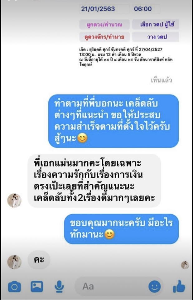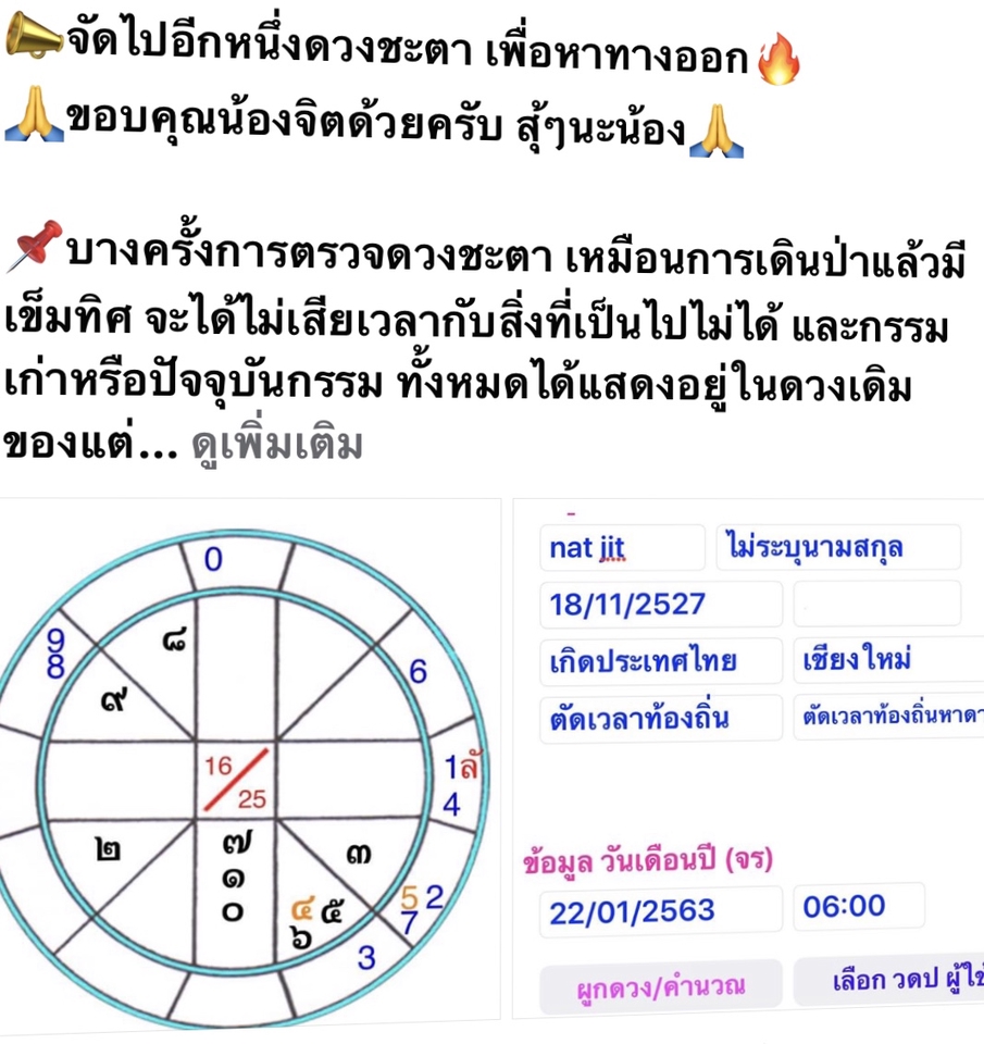 ศาสตร์แห่งการดูดวงที่แม่นยำและละเอียดที่สุดในระบบโหราศาสตร์ไทย ทำนายได้ลึกถึงรายนาที อดีต ปัจจุบัน อนาคต ความรัก การเงิน การงาน ฯลฯ ขั้นตอนการทำงาน 1. ติดต่อสอบถาม นัดวันและเวลาที่สะดวก 2. เตรียมข้อมูล วันเดือนปีเกิด จังหวัดเกิด เวลาเกิดจริงตามสูติบัตร ข้อมูลทั้งหมดจะเป็นการยืนยันตัวตนเจ้าของดวงชะตาเมื่อผูกดวงชะตาออกมาแล้วจะเป็นของแต่ละคนซึ่งทุกคนจะแตกต่างกันคือช่วงเวลาเกิดจริง และผลการทำนายที่ออกมาจะแม่นยำมากๆ กรณีไม่ทราบเวลาเกิดจริงแนะนำให้ผมหาเวลาเกิดให้ก่อนนะครับ หรือไม่สะดวกใช้การประมาณที่ใกล้เคียงได้เช่นกันดูภาพใหญ่ได้ แต่ถ้าต้องการลงรายละเอียดจริงๆแนะนำหาเวลเกิดครับครั้งเดียวใช้ได้ตลอดชีวิต 3. โอนเงินชำระค่าครูแล้วแจ้งทีมงาน 4. รับผลการตรวจดวงชะตาได้หลายช่องทางแล้วแต่สะดวก กรณีดูแบบละเอียดแนะนำเป็นทางโทรศัพท์ครับจะได้รายละเอียดที่ชัดเจนครับ