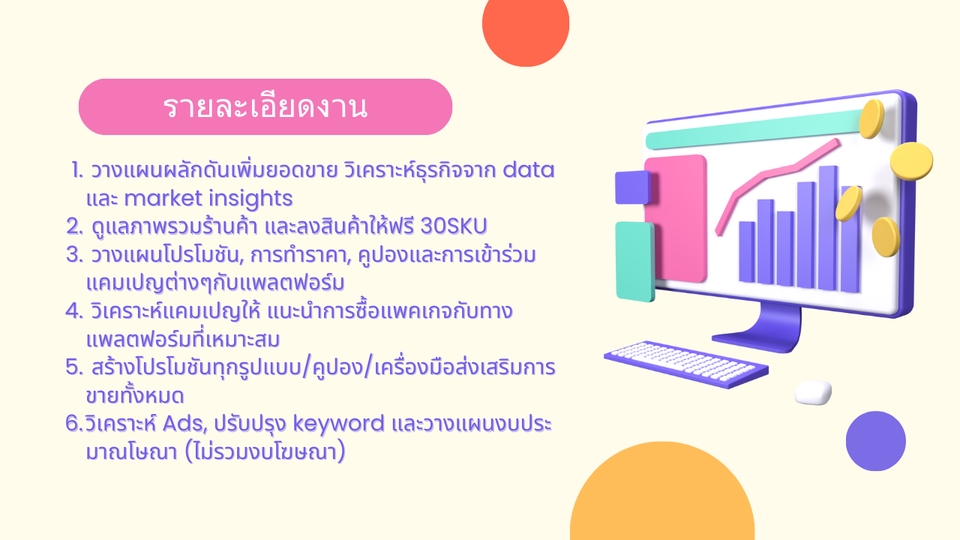฿5,000บริการดูแลร้านค้าสำหรับ 1 แพลตฟอร์ม 1. ลงสินค้าให้ฟรี 30 SKU (ลูกค้าต้องเตรียมข้อมูลสินค้าและรูปภาพเอง) 2. วางแผนผลักดันเพิ่มยอดขาย วิเคราะห์ธุรกิจจาก data และ market insights 3. วางแผนโปรโมชัน การทำราคา, คูปองส่วนลด, การเข้าร่วมแคมเปญต่างๆกับแพลตฟอร์ม 4. วิเคราะห์แคมเปญให้, แนะนำการซื้อแพคเกจกับแพลตฟอร์มที่เหมาะสม 5. สร้างโปรโมชันทุกรูปแบบ/คูปอง/โค้ดส่วนลด 6. ดูแลภาพรวมร้านค้า รูปหน้าร้านค้าและสินค้า (ไม่รวมการออกแบบ) 7. วิเคราะห์ Ads ปรับปรุง keyword และวางแผนงบประมาณโษณา (ไม่รวมงบโฆษณานะคะ)