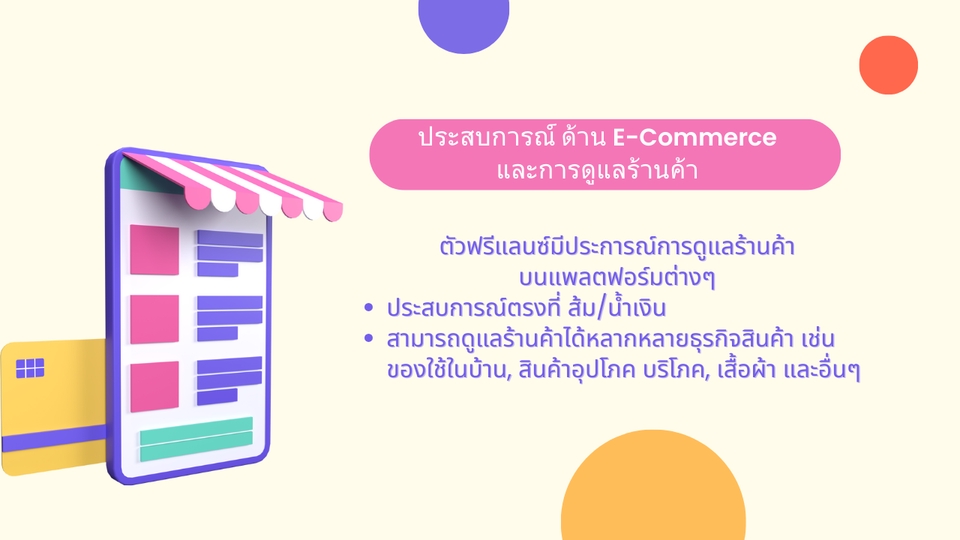ประสบการณ์การทำงานด้าน Digital marketing & E-commerce ทั้งหมด 4 ปี มีความเชี่ยวชาญในด้านการเป็นผู้ดูแลบัญชีร้านค้าบน marketplace (KAM) จากประสบการณ์ทำงานที่ Shopee และ NocNoc โดยสามารถนำความรู้มาต่อยอดและพัฒนายอดขาย มีความสามารถในการดู data analytics เพื่อ driven marketing และ GMV & Order ให้เติบโตขึ้นได้และยังมี Soft skill เช่น Nagotiation ในการเจรจาต่อรองกับลูกค้า