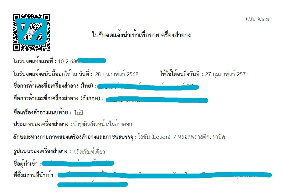 จดแจ้งอย. ผลิตภัณฑ์เครื่องสำอาง นำเข้า จน.1 / จค.1