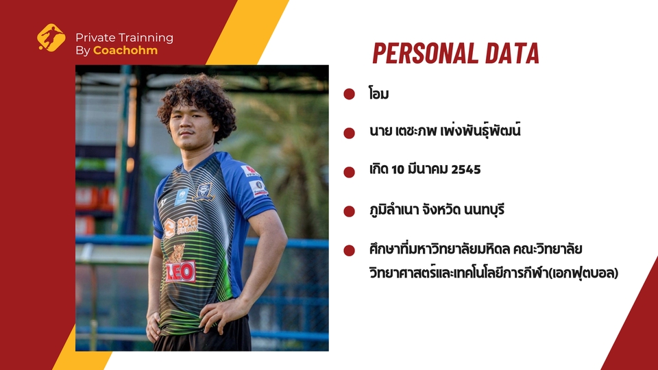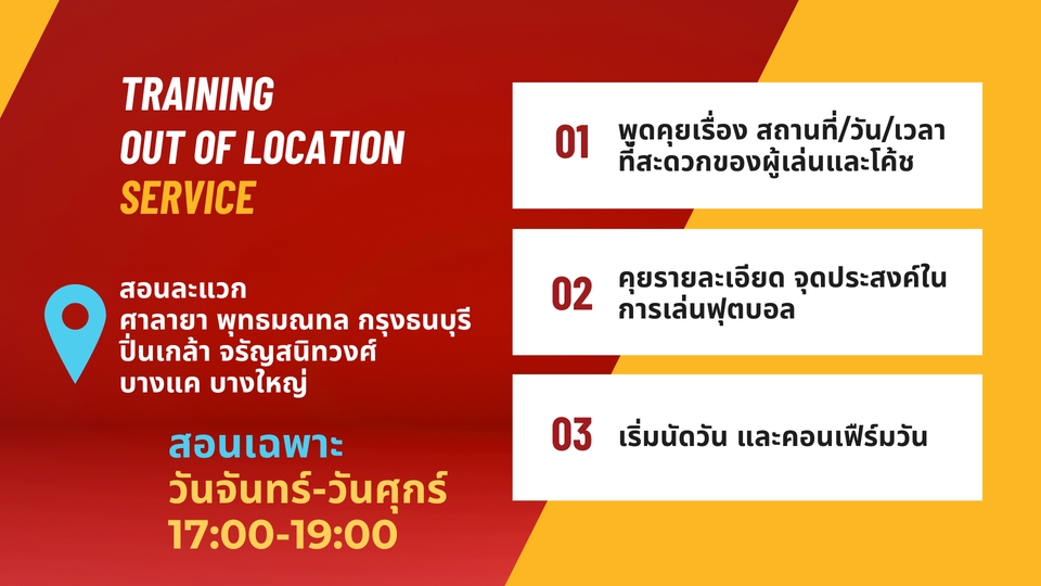 รับจ้างสอนฟุตบอลละแวกบางใหญ่ ปิ่นเกล้า ศาลายา นครปฐม เทรน Basic technique skill แบบตัวต่อตัว ไม่ว่าจะเป็นมือใหม่ฝึกหัด หรือระดับProfessional พร้อมออกแบบโปรแกรมให้ซ้อม จากอดีตนักฟุตบอลอาชีพ เรียนทางด้านสายฟุตบอล คณะวิทย์กีฬา มหาวิทยาลัยมหิดล เรียนฟรีครั้งแรกและมาคุยข้อตกลงกัน