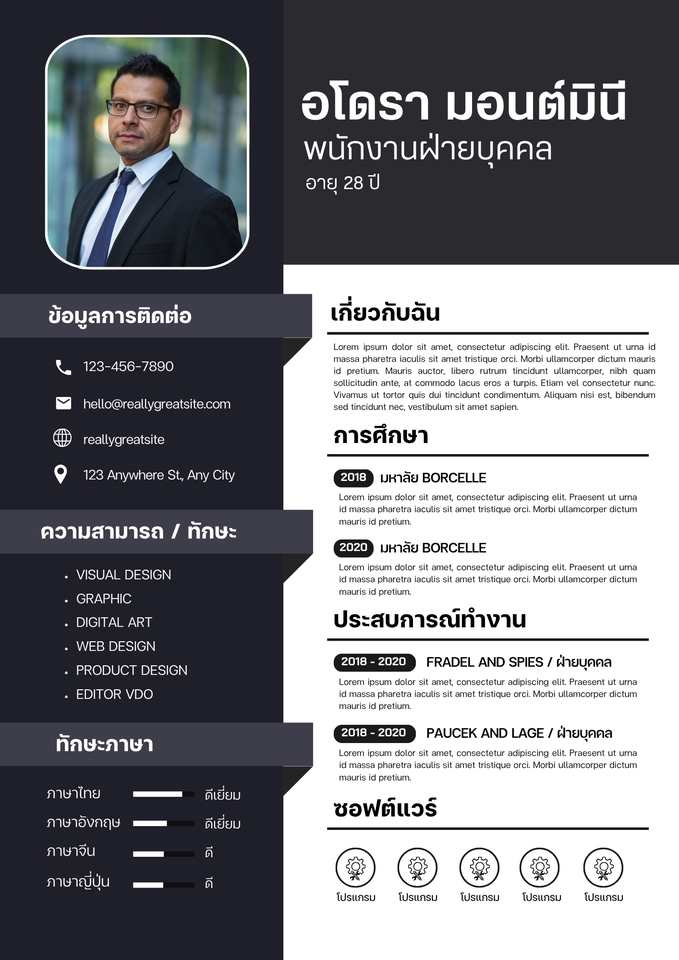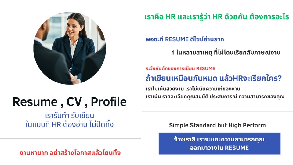 รับทำ Resume , CV , Profile อะไรก็แล้วแต่ที่มันจะทำให้คุณถูกเรียกสัมภาษณ์แล้วได้งาน เพราะเราคือทีมHRตัวจริง Recruiterมาเอง และเราจะไม่ทำแบบโกหก เราจะแกะความรู้ความสามารถของคุณออกมากางในResume ในแบบที่HRเห็นแล้วไม่กล้าปัดทิ้ง มันไม่เกี่ยวว่าคุณจะมีประสบการณ์ หรือเป็นนักศึกษาจบใหม่ ความสำคัญคือคุณPresentตัวเองได้ดีแค่ไหน ให้เราช่วยคุณ และแถมคำปรึกษาพิเศษก่อนการสัมภาษณ์ ให้คุณได้เตรียมตัวเตรียมใจ HRบอกตรงๆ อย่าไปกลัว คุณมีของ บอกเรา เราเขียนให้ ขั้นตอนการทำงาน 1. บรีฟรายละเอียดเบื้องต้นผ่านทางแชท 2. ลูกค้าส่งตัวตัวอย่างงานออกแบบ Resume ที่ต้องการให้กับเราเป็น Reference 3. ส่งข้อมูลส่วนตัว และประวัติการทำงานเบื้องต้นให้เรา 4. แกะความสามารถที่ซ่อนอยู่ และกางลงไปบนResume 5. ปรับแก้ไม่เสียค่าใช้จ่ายได้ 3 ครั้ง 6. ปิดงาน 7. หากต้องการคำแนะนำในการเตรียมตัวไปสัมภาษณ์งาน เราบริการฟรี สอบถามได้ไม่ติดกั๊ก