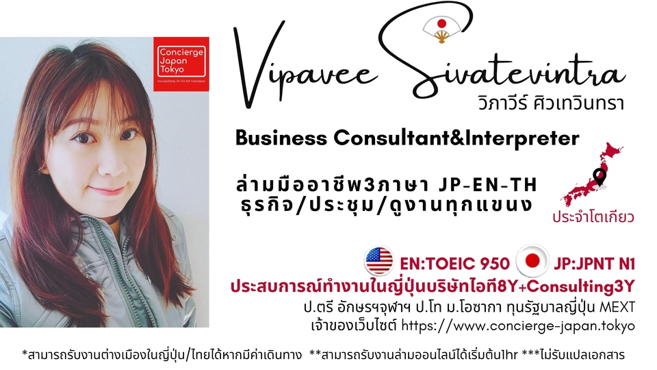 ล่ามฟรีแลนซ์ที่Tokyo ล่าม3ภาษา ล่ามพูดพร้อม ในเนื้อหาทุกแขนงได้ สามารถล่าม&ประสานงานในสถานการณ์การประชุมสำคัญภายในบริษัท หรือล่ามนอกสถานที่ไม่ว่าจะเป็นทริปดูงานในญี่ปุ่น สัมมนา การเจรจาระหว่างหน่วยงานระดับประเทศ การคุยธุรกิจหรือสัญญากับบริษัทญี่ปุ่น ด้วยประสบการณ์ทำงานบริษัทในโตเกียวมากกว่า12 ปี และอยู่ญี่ปุ่นกว่า15ปี