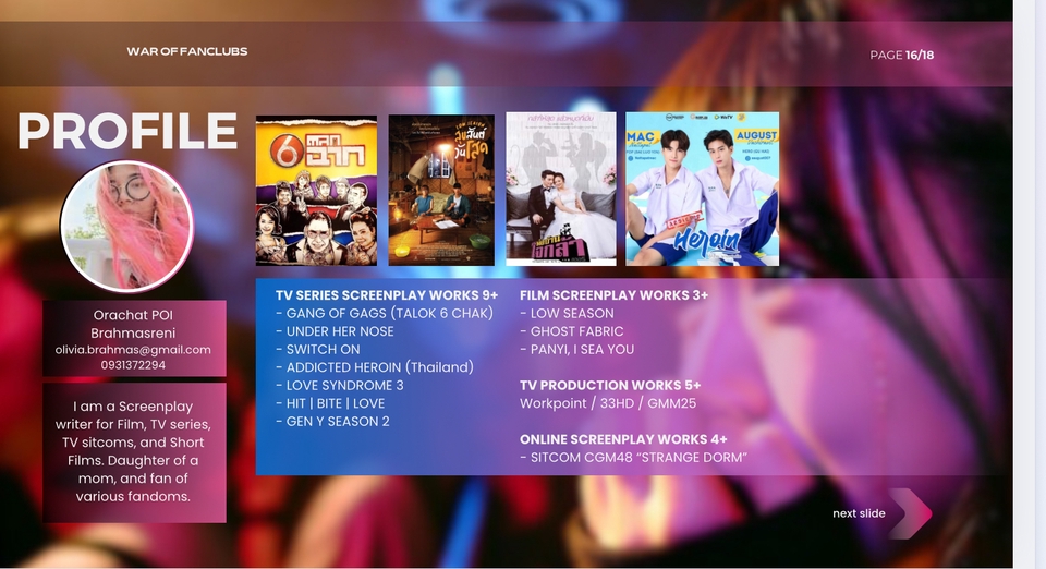 Professional ด้านงานครีเอทีฟ และนักเขียนบท ทั้งโทรทัศน์ และออนไลน์ มากกว่า 10 ปี ใน Wokpoint, Gmm และอื่นๆ แต่คุยง่าย น่ารัก รวมถึงสกิลหลากหลายไปจนถึง บรรณาธิการ พิสูจน์อักษร จัดเล่ม ทำวิดีโอโปรโมท