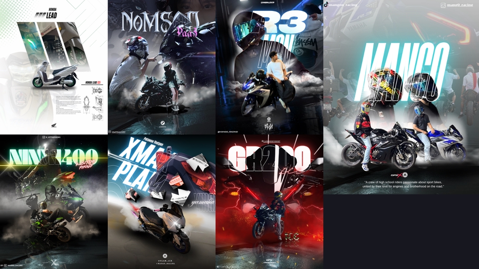 ออกแบบกราฟิก โดดเด่นด้วยแสงเงา เลเยอร์แน่น อารมณ์ชัด มืออาชีพ สายเท่ไม่ควรพลาด -ปกเพจ / โปรไฟล์นักบิด -โฆษณาแบรนด์รถ / เสื้อผ้า -แบนเนอร์ขายสินค้าแนวสตรีท