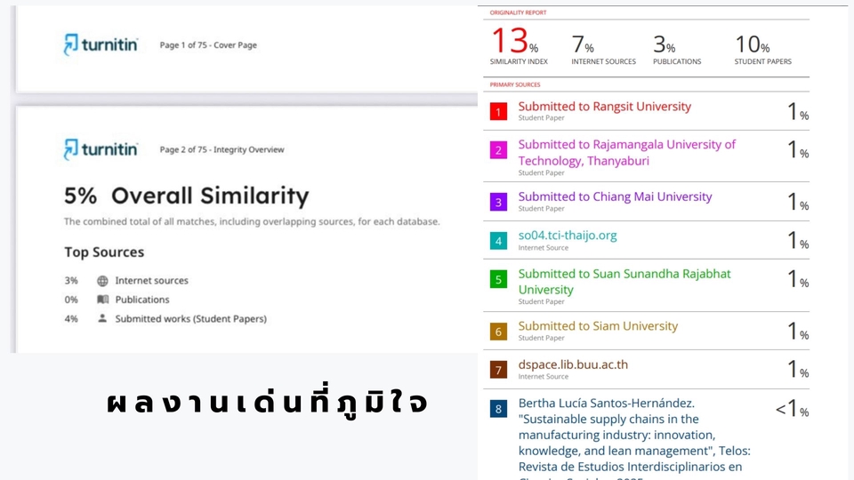 ฿600ตรวจสอบเอกสารผ่านระบบ Turnitin ส่งรายงานผล % ความซ้ำ (ภาษาไทยหรืออังกฤษ) เหมาะสำหรับงานที่ต้องการตรวจสอบเบื้องต้น *ราคาต่อครั้ง/ต่อไฟล์รวม (ไม่แยกไฟล์ตรวจ)