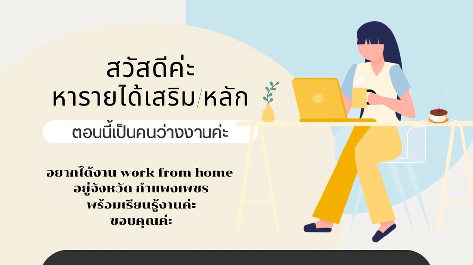 สวัสดีค่ะ ตอนนี้ว่างงานอยากได้งานที่ทำ work from home อยู่จังหวัด กำแพงเพชร พร้อมเรียนรู้งานนะคะ 🙏