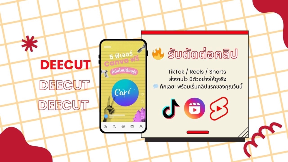 Deecut – Creative Edit for Every Cut เราคือทีมตัดต่อที่เข้าใจยุคของคอนเทนต์ไวรัล ด้วยประสบการณ์ในการตัดต่อคลิปสั้นอย่าง TikTok, Reels และวิดีโอรีวิว Deecut พร้อมช่วยให้คอนเทนต์ของคุณน่าสนใจ เข้าถึงง่าย และตรงใจกลุ่มเป้าหมาย บริการของเรา: 🎬 ตัดต่อคลิป TikTok / Reels / Shorts (9:16) 🔊 ใส่เสียงบรรยาย / ซาวด์ประกอบ (SFX) / ดนตรี 🎙 ตัดต่อเสียง พากย์เสียง รีวิวสินค้า 📱 ออกแบบคลิปให้เหมาะกับแพลตฟอร์ม (TikTok, IG, Youtube) ✨ รองรับทั้งลูกค้าแบรนด์ อินฟลูเอนเซอร์ และเจ้าของธุรกิจรายย่อย เราช่วยจัดการทุกขั้นตอน เพื่อให้คุณมีเวลาไปโฟกัสกับการสร้างสรรค์ไอเดียต่อไป Deecut – ตัดต่อให้ไว สไตล์ที่ใช่ เพื่อผลลัพธ์ที่ว้าว