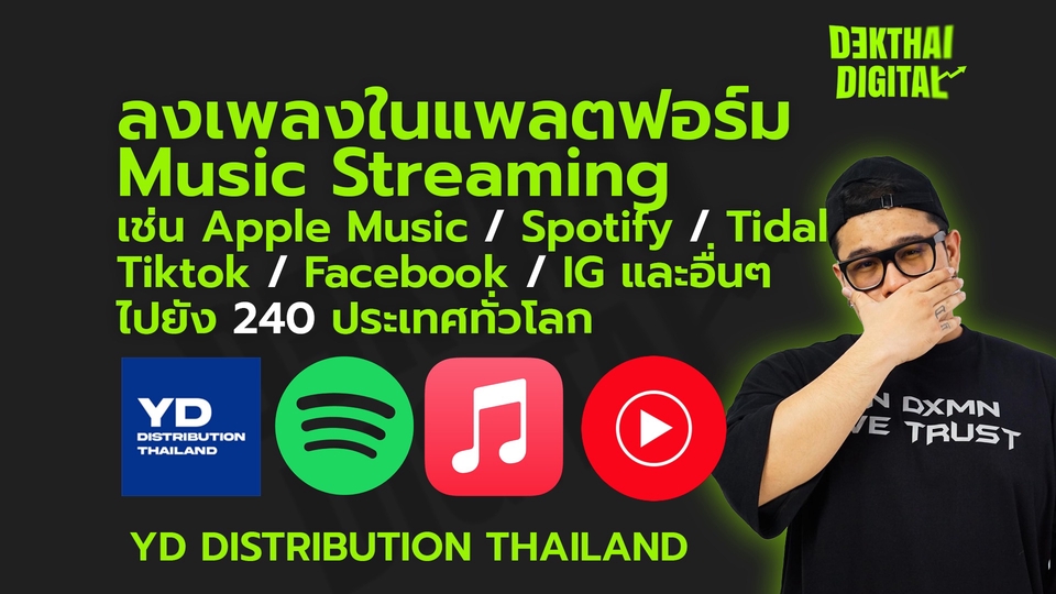 YD DISTRIBUTION THAILAND — ให้บริการลงเพลงในแพลตฟอร์ม Music Streaming เช่น Apple Music, Spotify, Tidal, Tiktok, Facebook, IG และอื่นๆ ไปยัง 240 ประเทศทั่วโลก *ข้อกำหนดการให้บริการ 1. เพลงต้องถูกลิขสิทธิ์เท่านั้น! 2. บีท/ดนตรี ต้องซื้อ/เช่า/สั่งทำใหม่แล้วเท่านั้น (บีทฟรีไม่สามารถลงได้หากยังไม่ติดต่อซื้อจาก Producer) 3. ไม่รับเพลง Cover / Remix ทุกรูปแบบหากไม่ใช่เพลงของตัวเอง 4. เพลงที่จะนำมาฝากลง Streaming กับทางเราจะต้องไม่เคยขายกับผู้บริการใดมาก่อน หากเคยขายมาก่อนให้ทำการยกเลิกกับผู้บริการนั้นก่อน 5. ลิขสิทธิ์เพลงเป็นของตัวศิลปิน แต่สิทธิ์ในการปล่อยเพลงลง Streaming ต่างๆ เป็นของ YD DISTRIBUTION THAILAND เพียงเจ้าเดียวเท่านั้น ห้ามขายซ้ำกับผู้บริการอื่น จนกว่าจะยกเลิกสัญญากับทางเราก่อน 6. ค่าบริการเพลงละ 109 บาท 7. สัญญาการปล่อยเพลงนี้มีอายุ 2 ปีนับตั้งแต่วันฝากเพลงเข้าระบบ ไม่สามารถถอนเพลงออกจากระบบได้จนกว่าจะครบระยะเวลาตามที่กำหนด (ต่อสัญญาอัตโนมัติ ไม่ต้องจ่ายเงินเพิ่ม จ่ายครั้งเดียว) *เกี่ยวกับรายได้ของเพลง – รายได้ทั้งหมดจะถูกหัก 30% โดยแบ่งเป็น 25% สำหรับ The Orchard และ 5% สำหรับ YD DISTRIBUTION THAILAND – ทาง YD DISTRIBUTION จะจับลิขสิทธิ์ใน YouTube (Content ID) และนำรายได้มารวมในระบบด้วย หากเพลงลูกค้าโดน Re-upload จะได้รับรายได้จากส่วนนั้น รวมไปถึงเพลงที่ศิลปิน Upload ใน YouTube เองเช่นกัน – รายได้จะโอนเข้าศิลปินปีละ 4 ครั้ง ดังนี้: รอบที่ 1 : รายได้ของเดือน มกราคม–มีนาคม โอนให้เดือนพฤษภาคม รอบที่ 2 : รายได้ของเดือน เมษายน–มิถุนายน โอนให้เดือนสิงหาคม รอบที่ 3 : รายได้ของเดือน กรกฎาคม–กันยายน โอนให้เดือนพฤศจิกายน รอบที่ 4 : รายได้ของเดือน ตุลาคม–ธันวาคม โอนให้เดือนกุมภาพันธ์ – การถอนเงิน: ต้องมีรายได้รวมเกิน 1,000 บาทขึ้นไป หากไม่ถึงจะนำไปรวมกับรอบถัดไป *** เงินจะโอนเข้าบัญชีของศิลปินที่ได้กรอกแบบฟอร์มประมาณวันที่ 28 ของเดือนนั้นๆ ***