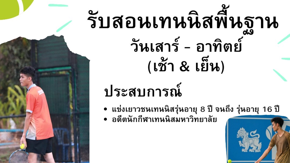 รับสอนเทนนิสพื้นฐาน ช่วงเวลาในการสอนเทนนิส วันเสาร์ - วันอาทิตย์ (ช่วงเช้า หรือ ช่วงเย็น) เป็นการสอนโดยมุ่งหวังให้ผู้ที่มาเรียนได้รับพื้นฐานในการเล่นกีฬาเทนนิสที่ถูกต้องและไว้สำหรับออกำลังกาย ขั้นตอนการทำงาน 1. สอบถามจุดประสงค์ของการเล่นเทนนิส 2. วางแผนการสอนเทนนิสให้เหมาะสมกับบุคคล 3. อธิบายรายละเอียดขั้นตอนการสอน 4. สอนพื้นฐานตั้งแต่การเริ่มจับไม้เทนนิสจนถึงขั้นตอนการตีเทนนิสให้ถูกต้อง