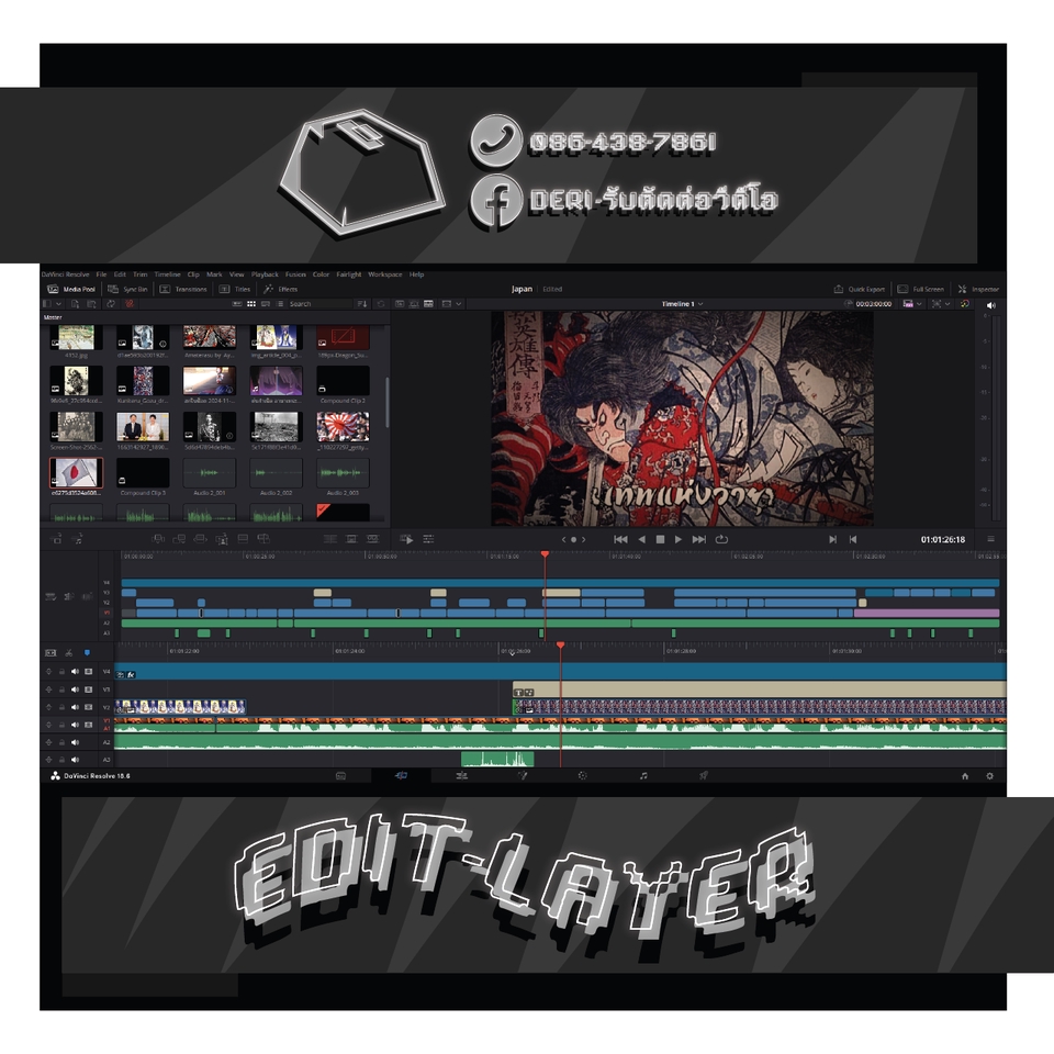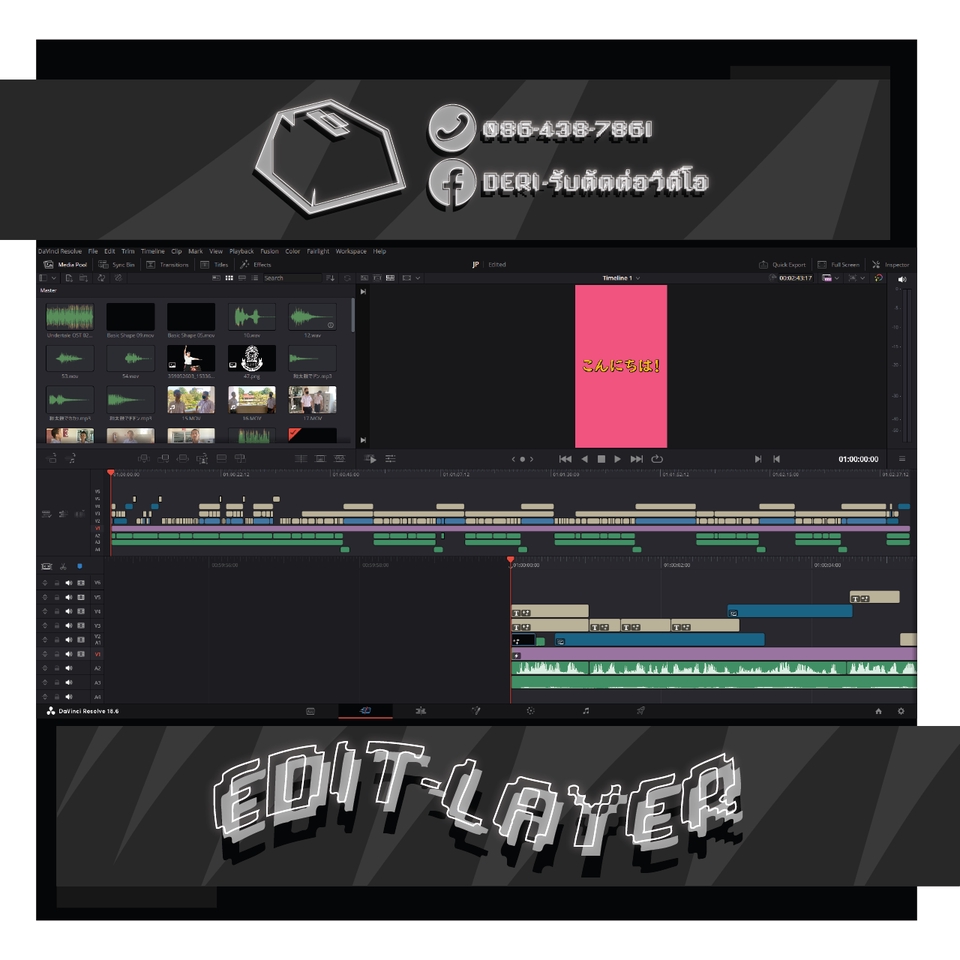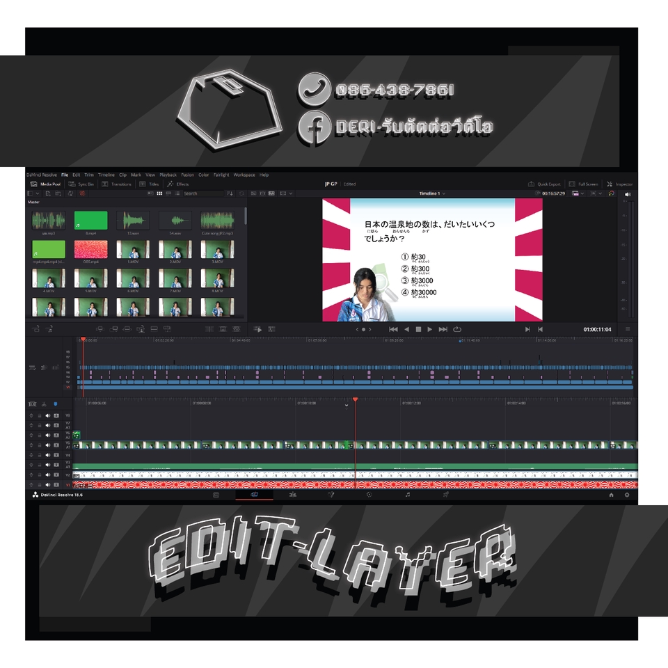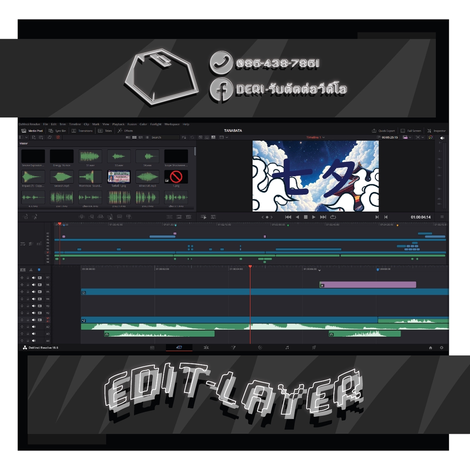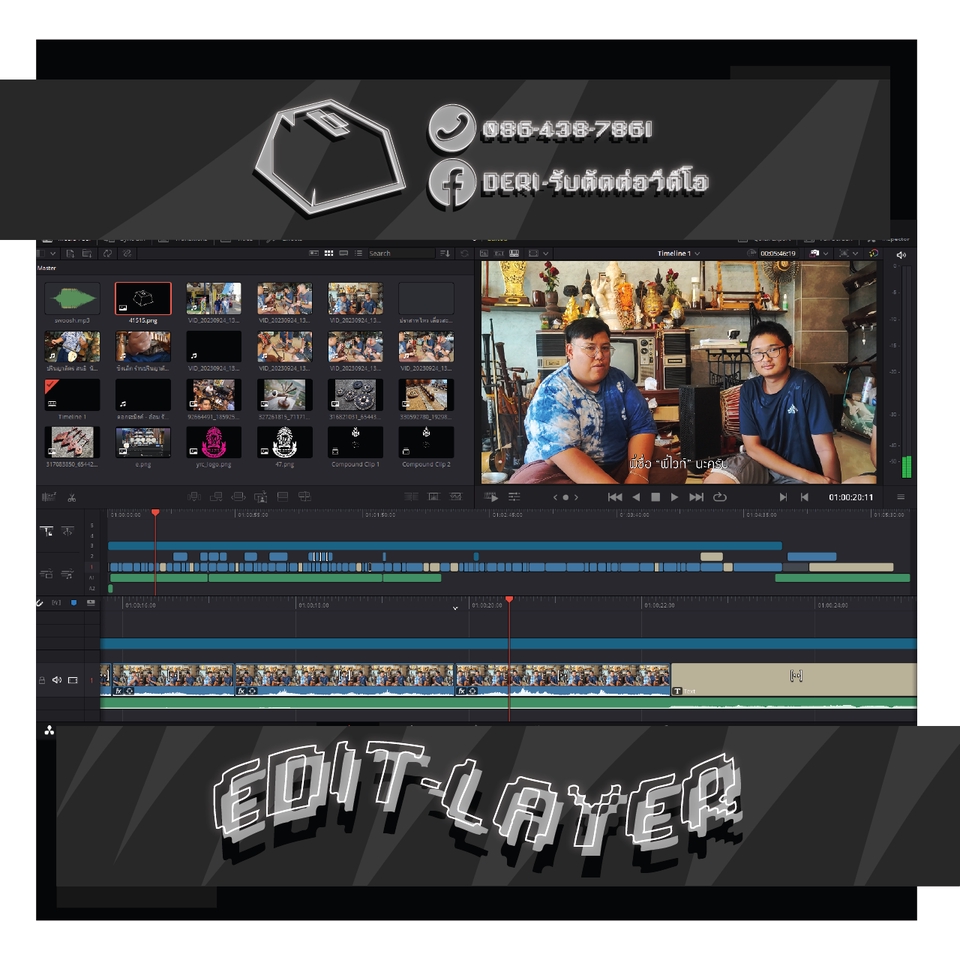 สิ่งที่คุณลูกค้าจะได้รับ... - งานคลิปวีดีโอมาตรฐานคุณภาพดี - งานวีดีโอสไตล์ที่คุณลูกค้าต้องการ หรือมี Reference - งานวีดีโอชัดระดับ Full HD 1080p60 ขึ้นไป หรือตามต้นฉบับไฟล์วีดีโอ สิ่งที่ลูกค้าควรเตรียมก่อนว่าจ้างงาน - ควรมี Storyboard หรือ สคริปต์ลำดับขั้นการดำเนินคลิปวีดีโอ - รูปแบบการตัดต่อ เช่น Resolution, ฟอนต์, เพลงประกอบ เป็นต้น - Reference ของวีดีโอที่คุณลูกค้าต้องการ Program Skill - DaVinci Resolve - Vegas Pro - Illustrator - Canva ตัวอย่างผลงาน By DERI - รับตัดต่อวีดีโอ Youtube : https://www.youtube.com/@DERI-รับตัดต่อวีดีโอ Video Editing : https://shorturl.asia/htOD8 Performance video background : https://shorturl.asia/EIdGC Motion Graphic : https://shorturl.asia/XRLnp 3D Animation : https://shorturl.asia/ZFxaX ผลงานจะคอย Update เรื่อยๆนะครับ