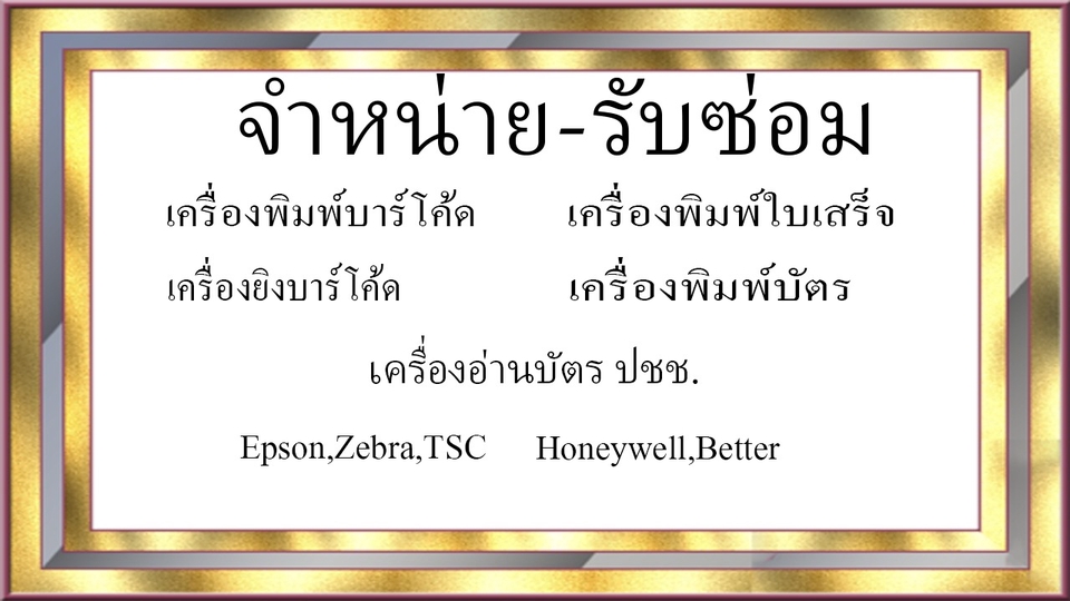 จำหน่าย และ รับซ่อม -เครื่องพิมพ์ใบเสร็จ -เครื่องพิมพ์บาร์โค้ด -เครื่องอ่านบัตร ปชช. -เครื่องพิมพ์บัตร -เครื่องยิงบาร์โค้ด -Ribbon+กระดาษ ยี่ห้อ Zebra, TSC, Honeywell, Epson, Better, Newland (สินค้าบางตัวอาจใช้เวลานานกว่าที่แจ้งในโพสนะครับเนื่องจากทางร้านไม่ได้สต็อคของไว้ครับ) ดูน้อยลง ขั้นตอนการทำงาน 1. ลูกค้าแจ้งอาการเสีย หรือ แจ้งรายละเอียดเครื่อง 2. ส่งเครื่อง 3. เช็คอาการ ประเมินราคาและเสนอราคา 4. หลังจากลูกค้าอนุมัติ+โอนเงินค่าซ่อม 5. ทำการสั่งของ+ซ่อม 6. ส่งเครื่องคืนลูกค้า