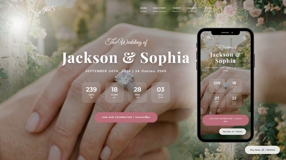 - • Wedding Website: หน้าเว็บหลักแสดงรูปภาพ , Story เรื่องราว, กำหนดการงานแต่ง, ธีมสี และข้อมูลสถานที่