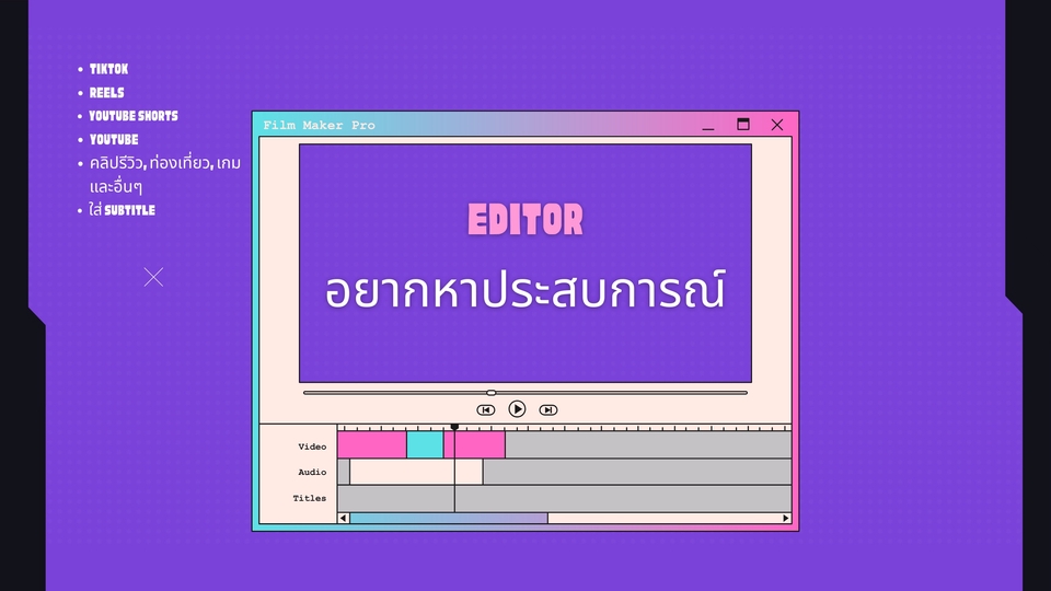 รายละเอียดงาน ตัดต่อคลิปสั้น - TIKTOK - Reels - Youtube Shorts ตัดต่อคลิปยาว - Youtube (หรือแพลตฟอร์มอื่น หากมี) ใส่ Subtitle ได้ ทั้งภาษาไทยและภาษาอังกฤษ ประสบการณ์และความเชี่ยวชาญ - *จบนิเทศศาสตร์ ฝึกงานเป็น Editor มีถ่ายภาพและวีดีโอบ้างตามหน้าที่และเนื้องาน ไม่มีประสบการณ์ทำงานจริงจังสายนี้มาก่อน เนื่องจากต้องดูแลภาระที่บ้าน จึงไม่มีโอกาส* - ยังพอมี Skill พื้นฐานสำหรับโปรแกรมต่างๆ เช่น Adobe Premier Pro, CapCut, Canva เป็นต้น ต้องการหาประสบการณ์ เก็บเกี่ยวประสบการณ์ เพื่อไปต่อยอดหารายได้ในอนาคตต่อไป