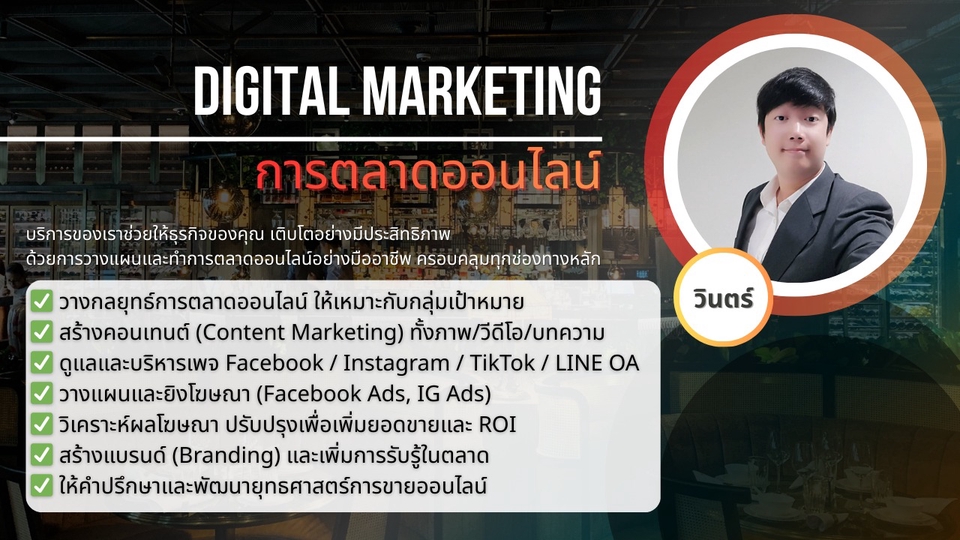 ✅ วางกลยุทธ์การตลาดออนไลน์ ให้เหมาะกับกลุ่มเป้าหมาย ✅ สร้างคอนเทนต์ (Content Marketing) ทั้งภาพ/วีดีโอ/บทความ ✅ ดูแลและบริหารเพจ Facebook / Instagram / LINE OA ✅ วางแผนและยิงโฆษณา (Facebook Ads, IG Ads) ✅ วิเคราะห์ผลโฆษณา ปรับปรุงเพื่อเพิ่มยอดขายและ ROI ✅ สร้างแบรนด์ (Branding) และเพิ่มการรับรู้ในตลาด ✅ ให้คำปรึกษาและพัฒนายุทธศาสตร์การขายออนไลน์