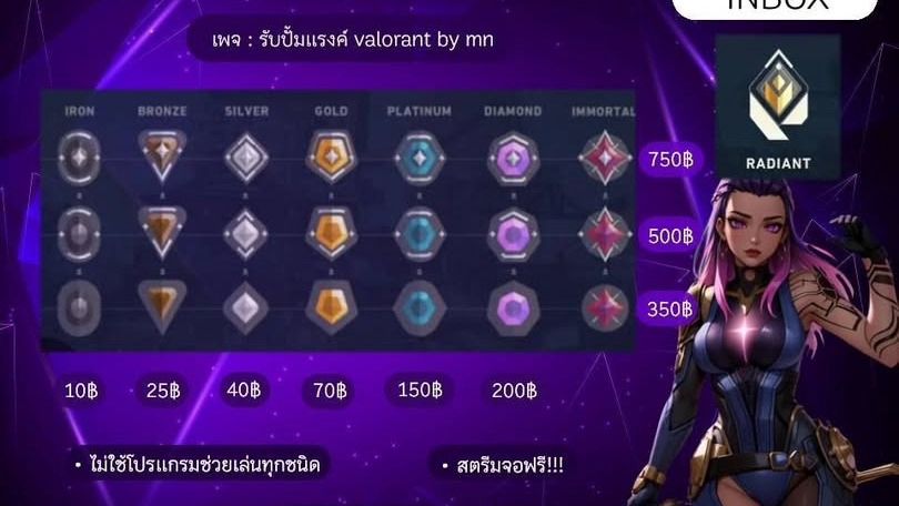 ฿750Platinum 80บาทต่อขั้น Diamond 150บาทต่อขั้น Ascendant 210บาทต่อขั้น แรงค์อื่นๆสอบถามได้งับ