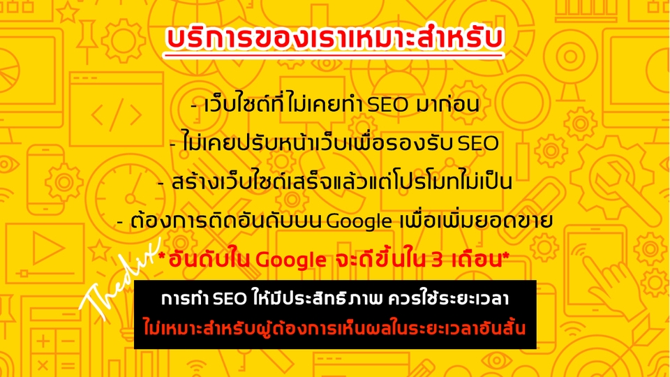 ผมทำ SEO แบบโฟกัสผลลัพธ์จริง ไม่ใช่แค่รายงานสวย ๆ เราเริ่มจาก Audit ให้เห็นปัญหาหลัก วาง Content Map ตามเจตนาค้นหา เสริม Authority ด้วยลิงก์คุณภาพ และใช้ AI ช่วยหาโอกาสเชิงเอนทิตี/หัวข้อ แล้ววัดผลผ่าน GA4/GSC เพื่อปรับแผนทุกเดือน เป้าหมายคือให้ Organic โตและคำหลักสำคัญติดหน้าแรกอย่างยั่งยืน - Technical & On-page SEO: Crawl/Index, Core Web Vitals, Speed, Internal Link, Title/Meta/Schema - Keyword & Intent Mapping: จัดกลุ่มคำหลัก จับคู่หน้าเป้าหมาย Commercial/Informational และวาง Topical Map - Content SEO: วางแผนและเขียนบทความเชิงลึก อ่านลื่น มีข้อมูล เพิ่ม CTR ด้วย FAQ/Schema - Backlink & Authority: ทำลิงก์คุณภาพ/Brand Mention/Local/Digital PR ตามความเหมาะสม (ไม่ฟิกจำนวน เน้นผลและความปลอดภัย) - AI SEO Assist: วิเคราะห์ Topic Gap/Entity/Link Gap และโอกาส CTR - Tracking & Reporting: รายงานอันดับ/ทราฟฟิก/โอกาสใหม่ ๆ จาก GA4/GSC ท้ายเดือน แพ็กเกจและราคา - รายเดือน 15000 บาท - รายเดือน 25000 บาท หมายเหตุ: แพ็ก 25k การันตีอันดับคีย์เวิร์ดที่ผ่านเกณฑ์ขึ้นหน้าแรก และ Organic โต ≥100% โดยประเมินคำและศักยภาพเว็บไซต์ก่อนเริ่มงาน ขอบเขตอื่นเหมือนแพ็ก 15k ประสบการณ์และความเชี่ยวชาญ - ทำ SEO ให้ธุรกิจไทยหลายกลุ่ม ทั้งคลินิก อุตสาหกรรม B2B E-commerce และ Local ประสบการณ์มากกว่า 10 ปี - ถนัด Technical/On-page/Content/Off-page วางแผนเชิง Intent และ Topical Authority - ใช้ GA4, GSC, Looker Studio, Keyword Clustering, Schema, Local SEO ขั้นตอนการทำงาน - Discovery: รับเป้าหมายธุรกิจ พื้นที่ทำการ หน้าเงิน และคู่แข่ง 2–3 เจ้า - Audit & Research: สแกนเทคนิค/คู่แข่ง/โอกาสคีย์เวิร์ด สรุป Roadmap เดือนแรก - Quick Wins: แก้จุดกระทบอันดับทันที เช่น Title/Meta/Internal Link/Speed/Index - Content & Authority: อัปเดตหน้าเป้าหมาย เขียนคลัสเตอร์บทความ ทำลิงก์คุณภาพ - Measure & Learn: รายงานอันดับ/ทราฟฟิก วิเคราะห์ CTR/Conversion และปรับแผน - Scale: ขยายคลัสเตอร์/ลิงก์/หน้า Commercial ที่มีโอกาสปิดการขายสูง สิ่งที่ต้องการจากลูกค้า - รายชื่อคีย์เวิร์ดหลัก หน้าเป้าหมาย และคู่แข่ง 2–3 เจ้า - สิทธิ์เข้าถึงเว็บไซต์ GA4 และ GSC - นโยบายคอนเทนต์/ข้อจำกัดแบรนด์ และข้อมูลธุรกิจที่ควรเน้น - ความร่วมมือในการปรับแก้เชิงเทคนิคฝั่งโฮสติ้ง/ธีม/ปลั๊กอิน (ถ้ามี) ข้อกำหนดและเงื่อนไข - การันตีหน้าแรกใช้กับคีย์เวิร์ดที่เหมาะกับศักยภาพเว็บและผ่านเกณฑ์ความยาก โดยต้องร่วมมือปรับปรุงตามแผนที่เสนอ - ระยะเวลาเห็นผลขึ้นกับอุตสาหกรรม คู่แข่ง และประวัติโดเมน โดยทั่วไป 1–3 เดือนเริ่มขยับ ชัดใน 3–6 เดือน - ไม่ใช้เทคนิคที่เสี่ยงโดนลงโทษจากเสิร์ชเอนจิน เน้นความยั่งยืนระยะยาว - ค่าใช้จ่ายเครื่องมือ/คอนเทนต์พิเศษ/ลิงก์เฉพาะทาง (ถ้ามี) จะแจ้งก่อนทุกครั้ง