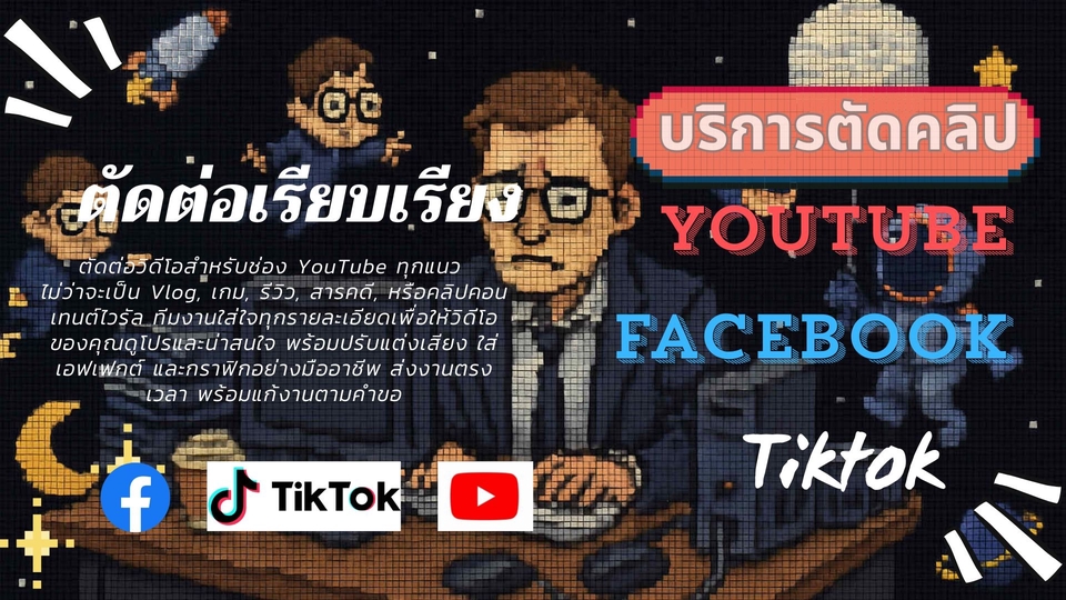 ฿1,000ตัดต่อวิดีโอสำหรับช่อง YouTube ทุกแนว ไม่ว่าจะเป็น Vlog, เกม, รีวิว, สารคดี, หรือคลิปคอนเทนต์ไวรัล ทีมงานใส่ใจทุกรายละเอียดเพื่อให้วิดีโอของคุณดูโปรและน่าสนใจ พร้อมปรับแต่งเสียง ใส่เอฟเฟกต์