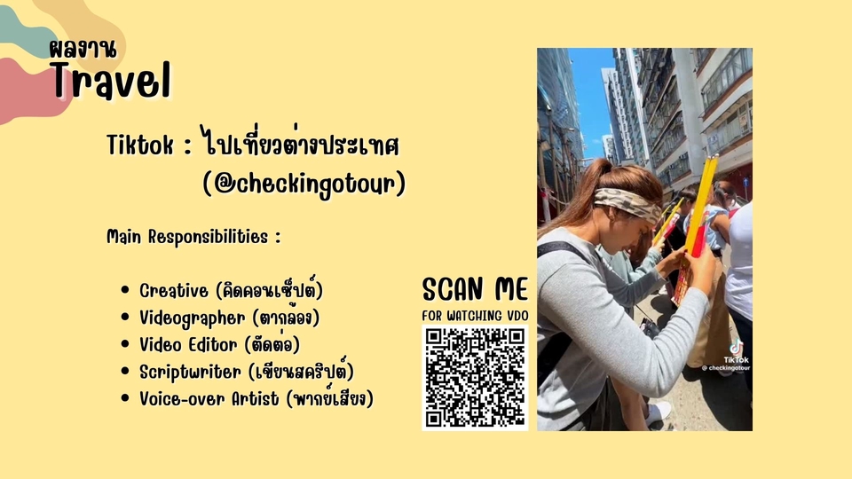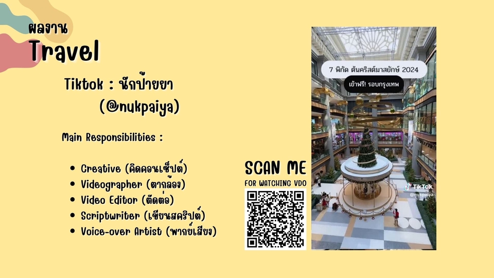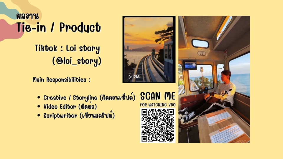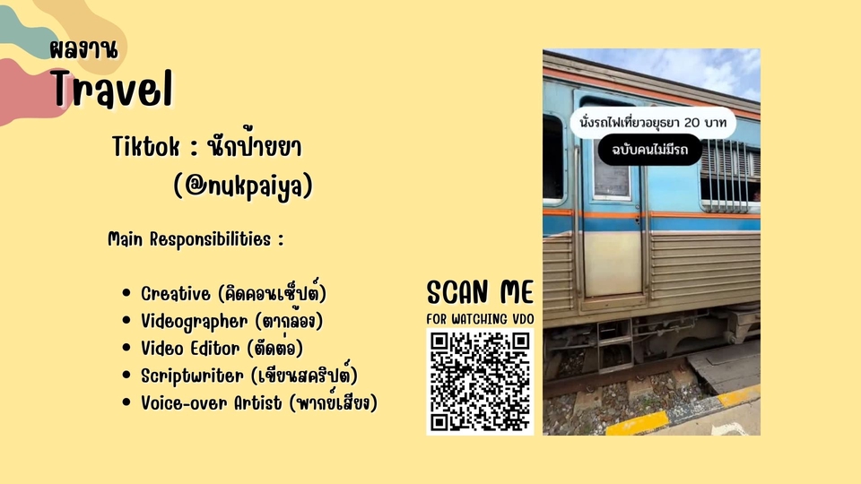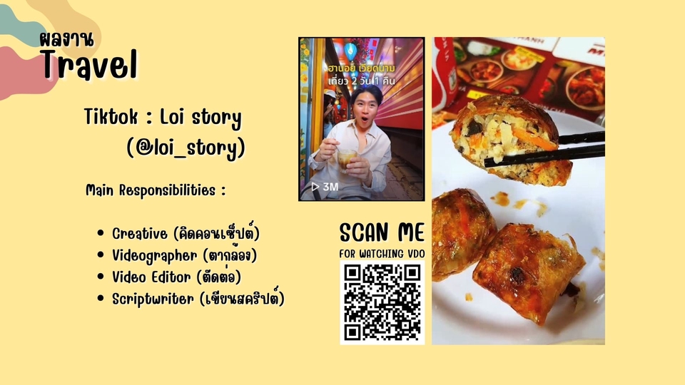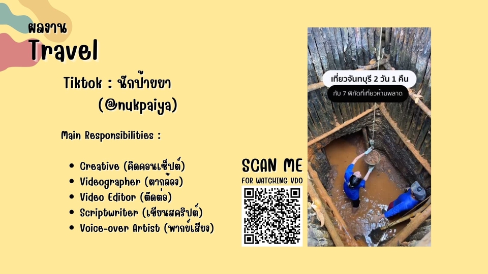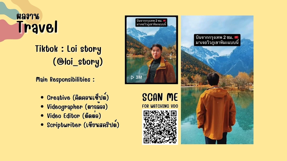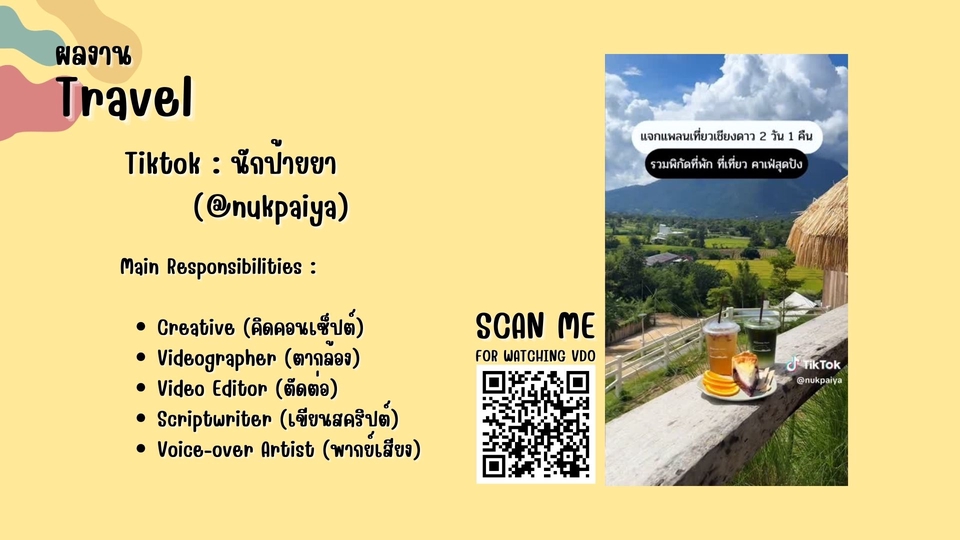มีประสบการณ์ทำงานด้าน Content Creator ท่องเที่ยว และเป็นช่างภาพ+ตัดต่อ VDO ให้ Travel Blogger มากกว่า 2 ปี ถ่ายภาพ/วิดีโอผ่านมือถือ (ใช้ DJI Pocket 3) และตัดต่อผ่าน Capcut มีทักษะเขียน Storyline ผสม Tie-in สินค้า เขียนสคริปต์ให้เข้าใจง่าย มีช่อง YouTube ของตัวเอง และชอบเขียนนิยายออนไลน์ในเวลาว่าง