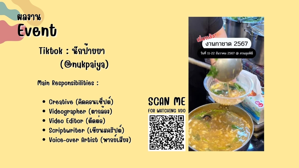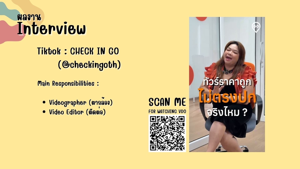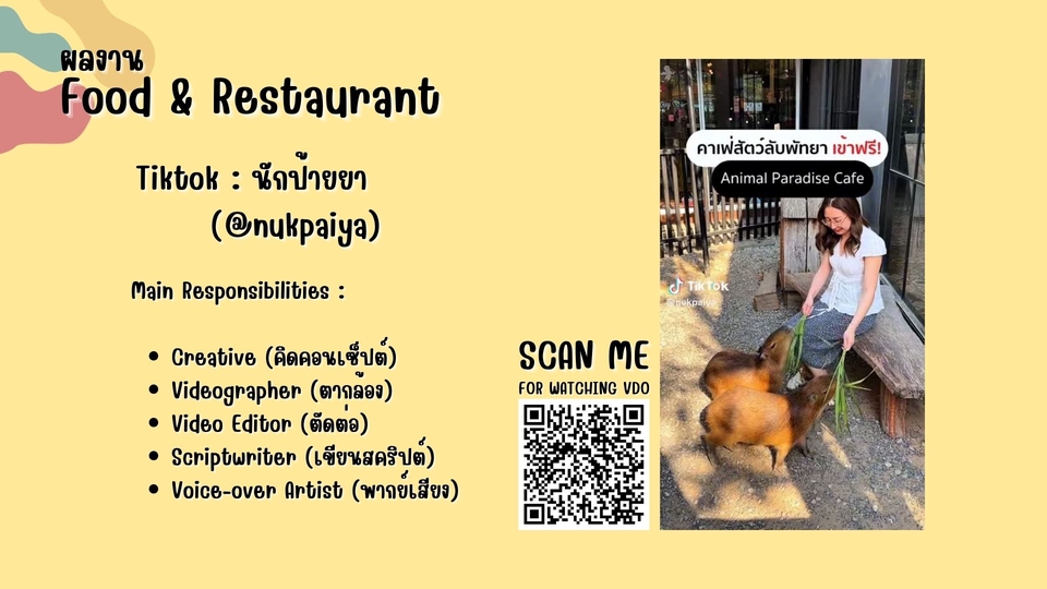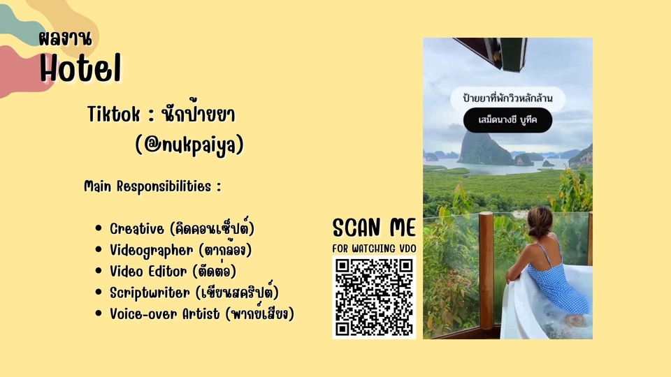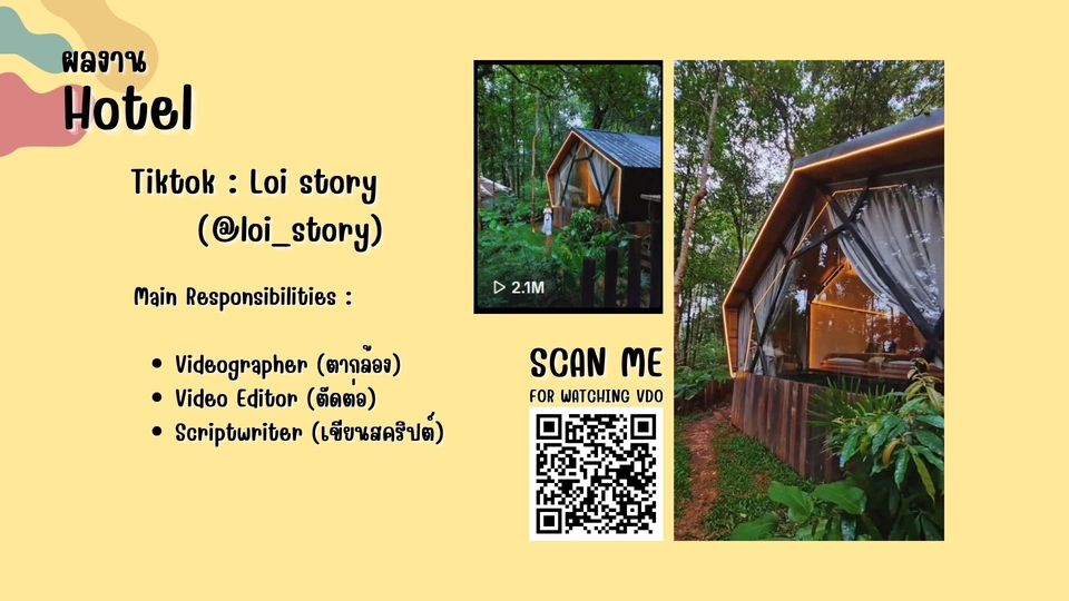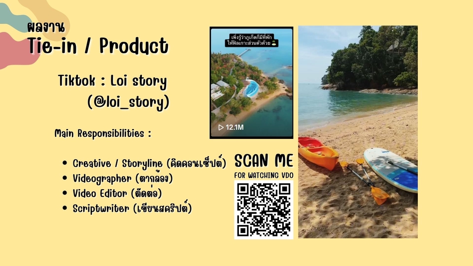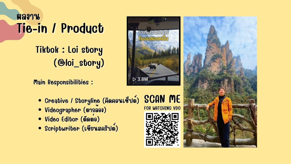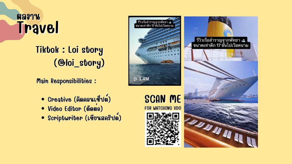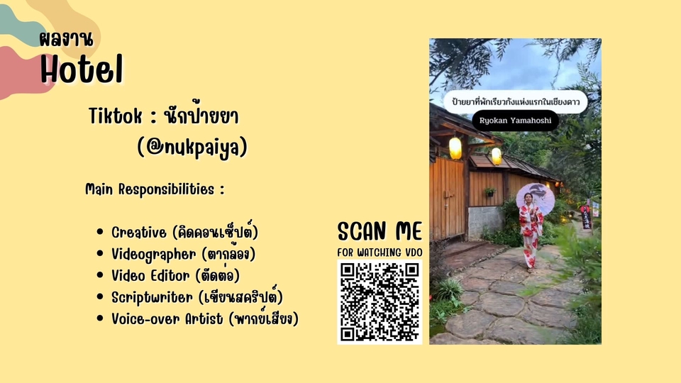 มีประสบการณ์ทำงานด้าน Content Creator ท่องเที่ยว และเป็นช่างภาพ+ตัดต่อ VDO ให้ Travel Blogger มากกว่า 2 ปี ถ่ายภาพ/วิดีโอผ่านมือถือ (ใช้ DJI Pocket 3) และตัดต่อผ่าน Capcut มีทักษะเขียน Storyline ผสม Tie-in สินค้า เขียนสคริปต์ให้เข้าใจง่าย มีช่อง YouTube ของตัวเอง และชอบเขียนนิยายออนไลน์ในเวลาว่าง