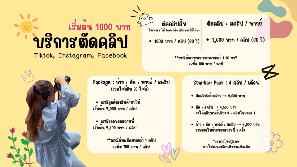 ฿2,000อุปกรณ์ DJI Osmo Pocket 3 - กรณีลูกค้าส่งสินค้ามาให้ เริ่มต้น 2,000 บาท / คลิป - กรณีออกนอกสถานที่ (เฉพาะกรุงเทพและนนทบุรี) เริ่มต้น 2,800 บาท / คลิป **กรณีถ่าย/ตัดมากกว่า 1 คลิป +700 บาท / คลิป