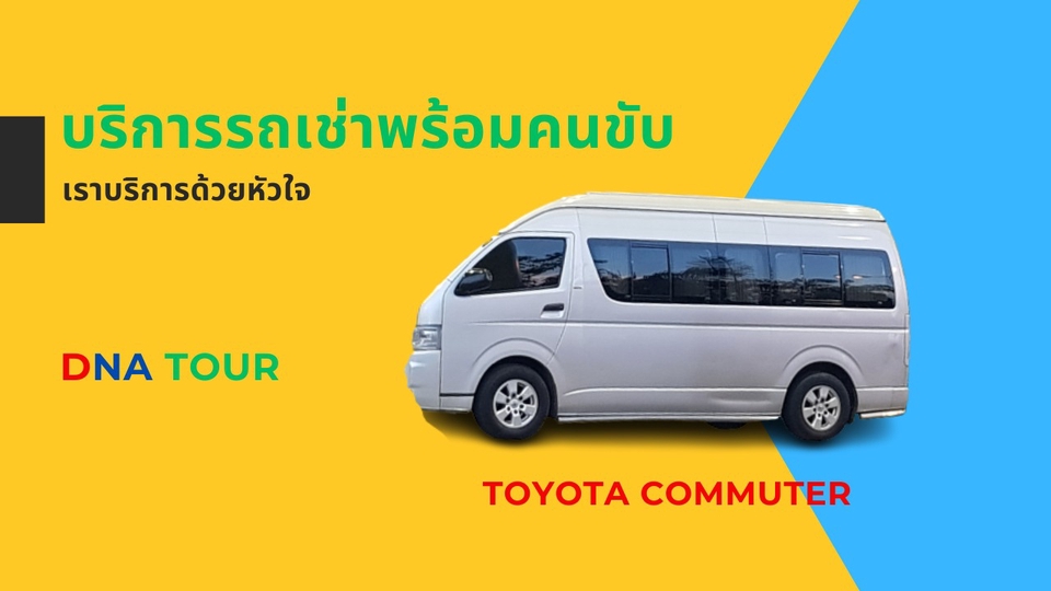฿2,500รถตู้ Toyota Commuter VIP 8-10 ที่นั่ง คนขับสื่อสารภาษาอังกฤษได้ ราคาไม่รวมน้ำมันเชื้อเพลิงและค่าใช้จ่ายอื่นๆ ใช้รถได้ 10 ชม. ถ้าเกินเวลา OT ชั่วโมงละ 200 บาท ค่าที่พักบวกค่าอาหารคนขับวันละ 1,000 บาท