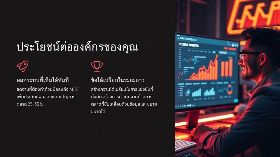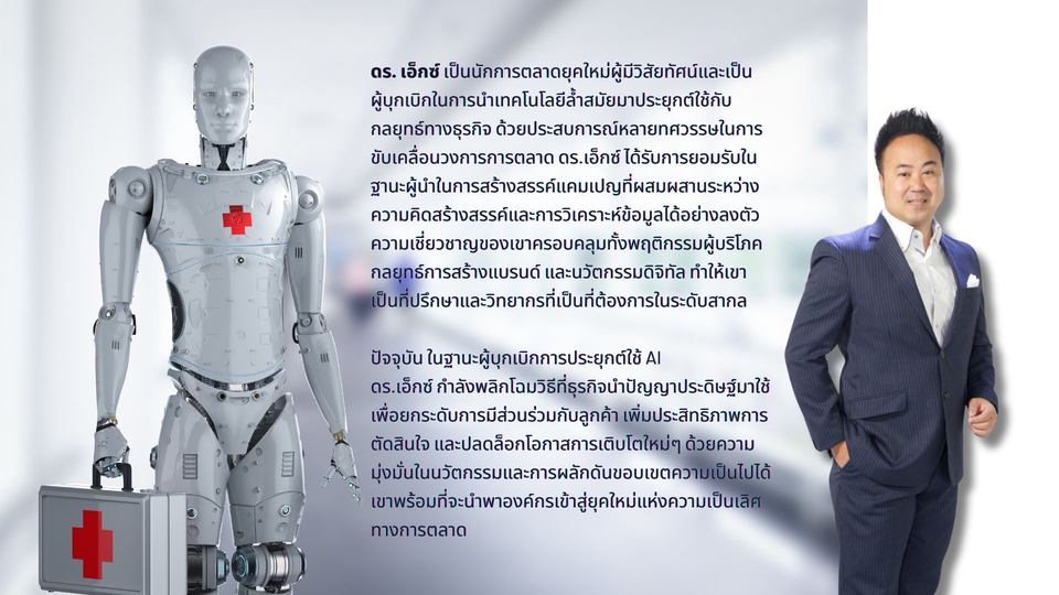 บริการให้คำปรึกษาด้าน AI ของเรามุ่งเน้นการยกระดับการตลาดขององค์กรในยุคดิจิทัล ด้วยทีมผู้เชี่ยวชาญที่มีประสบการณ์ด้านการตลาดและ AI มากกว่าทศวรรษ เราให้บริการครบวงจรตั้งแต่การวางกลยุทธ์ การประเมินโอกาส การพัฒนาโซลูชันที่ปรับแต่งเฉพาะองค์กร ไปจนถึงการนำไปใช้และการติดตามผล โดยมีผลงานที่พิสูจน์แล้วในการช่วยลูกค้าลดงานที่ต้องทำด้วยมือลงถึง 40% เพิ่มประสิทธิผลแคมเปญการตลาด 25-35% และปรับปรุงอัตราการมีส่วนร่วมของลูกค้าเพิ่มขึ้น 50% พร้อมทั้งสร้างความได้เปรียบในการแข่งขันที่ยั่งยืนผ่านการพัฒนาขีดความสามารถด้าน AI ภายในองค์กรของคุณ เราพร้อมช่วยให้องค์กรของคุณก้าวสู่การเป็นผู้นำด้านการตลาดที่ขับเคลื่อนด้วย AI อย่างมีประสิทธิภาพและยั่งยืน ขั้นตอนการทำงาน 1. สัปดาห์ที่ 1: การวิเคราะห์และวางแผน วันที่ 1-2: ประชุมเข้าใจธุรกิจและเป้าหมาย วันที่ 3-4: ประเมินระบบปัจจุบันและโอกาส วันที่ 5: นำเสนอแผนงานและกำหนด KPI 2. สัปดาห์ที่ 2: การออกแบบโซลูชัน วันที่ 1-2: เลือกและปรับแต่งโมเดล AI วันที่ 3-4: วางแผนการผสานระบบ วันที่ 5: นำเสนอแบบโซลูชันเพื่อขออนุมัติ 3. สัปดาห์ที่ 3: การติดตั้งและทดสอบ วันที่ 1-3: ติดตั้งระบบและโมเดล AI วันที่ 4: ทดสอบระบบ วันที่ 5: ฝึกอบรมทีมหลัก 4. สัปดาห์ที่ 4: การเปิดใช้งานและปรับแต่ง วันที่ 1-2: เริ่มใช้งานระบบ วันที่ 3-4: เก็บผลตอบรับและปรับแต่ง วันที่ 5: สรุปผลและวางแผนการสนับสนุนต่อเนื่อง 5. หลังจากนี้: บริการสนับสนุน 3 เดือนแรกฟรี ให้คำปรึกษาทางเทคนิค ปรับแต่งระบบตามความต้องการ ฝึกอบรมเพิ่มเติมตามจำเป็น รายงานผลการดำเนินงานรายเดือน