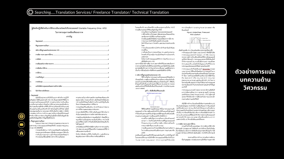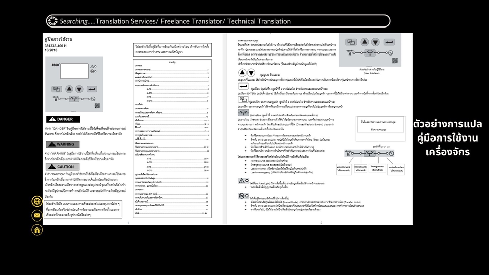 รับแปลภาษา ไทย <<>> อังกฤษ <<>> ไทย คู่มือ, เอกสารทางด้านเทคนิค, การเงิน การธนาคาร, Specification, Paper, งานวิจัย, หนังสือ สิ่งพิมพ์ต่างๆ จบการศึกษาด้านวิศวกรรม ประสบการณ์โดยตรงในสายงาน วิทยาศาสตร์ วิทยาศาสตร์สุขภาพ การวิจัย งานก่อสร้าง โรงงาน งานวิศวกรรม การบริหารธุรกิจ มากกว่า 10 ปี ขั้นตอนการทำงานสำหรับ 1. รับไฟล์งาน เพื่อประเมินชิ้นงานที่ต้องการให้แปล 2. คุยตกลงรายละเอียดและความต้องการของลูกค้า 3. ทำการแปลเอกสารให้ลูกค้าตามระยะเวลาที่กำหนด 4. ส่งมอบงานให้ลูกค้า เป็นไฟล์ต้นฉบับ ขั้นตอนการทำงาน 1. รับไฟล์งาน เพื่อประเมินชิ้นงานที่ต้องการให้แปล 2. คุยตกลงรายละเอียดและความต้องการของลูกค้า 3. ทำการแปลเอกสารให้ลูกค้าตามระยะเวลาที่กำหนด 4. ส่งมอบงานให้ลูกค้า เป็นไฟล์ต้นฉบับ